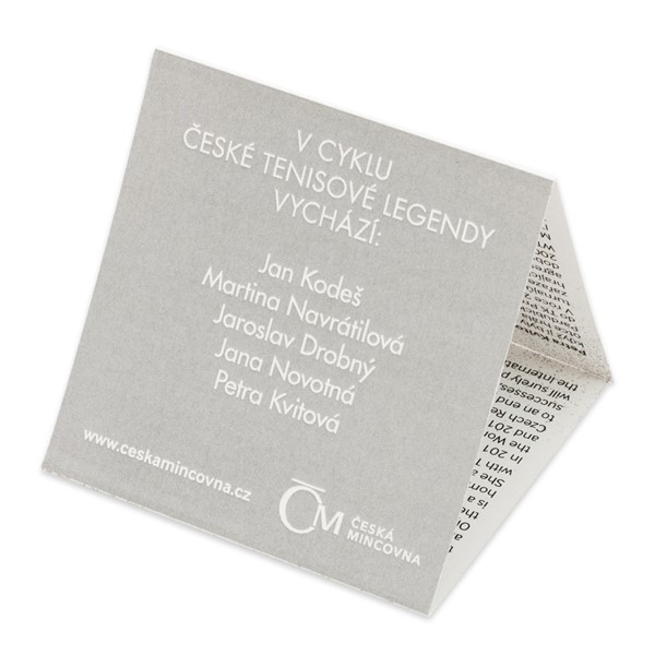 Každá mince je doplněna speciálním česko-anglickým certifikátem pravosti, který shrnuje sportovní kariéru Petry Kvitové slovy wimbledonského vítěze Jana Kodeše. Kompletní pětici českých tenisových legend si můžete uložit do dřevěné sběratelské krabičky, kterou rovněž najdete v nabídce České mincovny.
