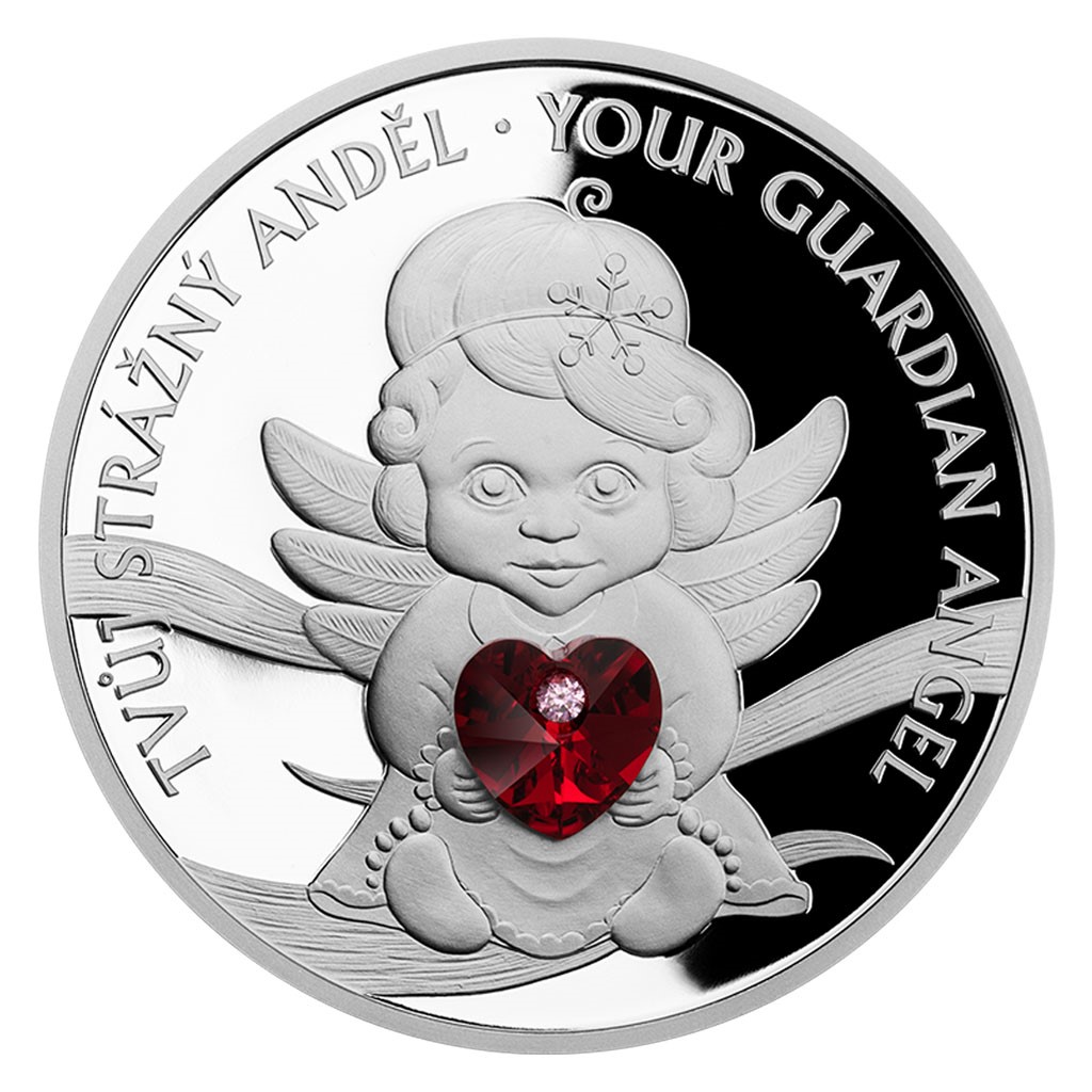 Stříbrná mince Crystal Coin - Anděl strážný se srdíčkem proof
