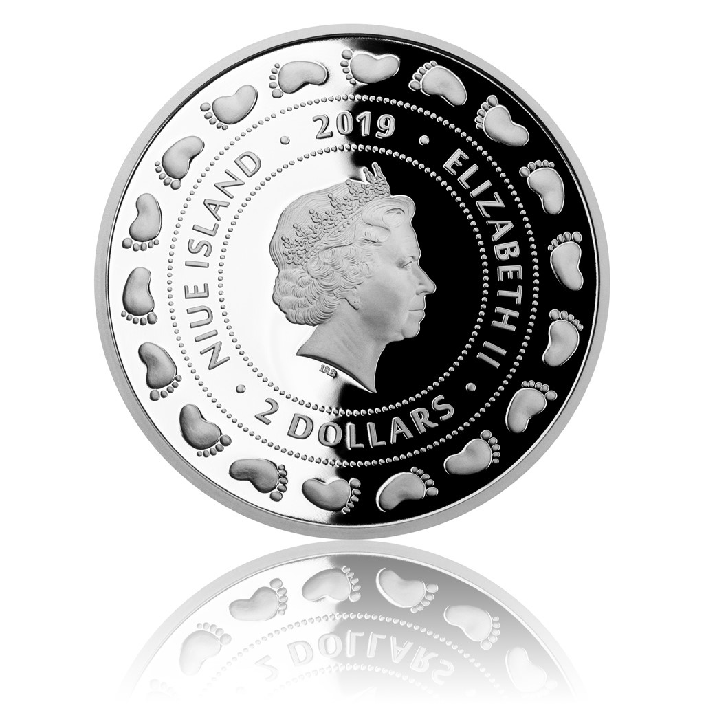 Reverzní strana pamětní mince předkládá kombinaci raženého reliéfu, broušeného českého křišťálu a tradiční symboliky. Nožičky novorozeného miminka jsou drobné, křehké a roztomilé – rostou jako z vody a připomínají, jak bylo děťátko malinké, když si ho rodiče přinesli domů. V podání nadané medailérky Ireny Hradecké, DiS., nožičky doplňují ještě další dětské motivy spolu s dvoujazyčným opisem NEWBORN BABY – K NAROZENÍ DÍTĚTE. Protože mince České mincovny vycházejí v licenci zahraničního emitenta, kterým je ostrov Niue, nese jejich averzní strana jeho nezbytné atributy – nominální hodnotu 2 DOLLARS (NZD), rok emise 2019, jméno Alžběty II. a portrét královny, který je obklopen řadou dalších otisků nožiček.