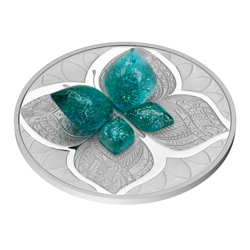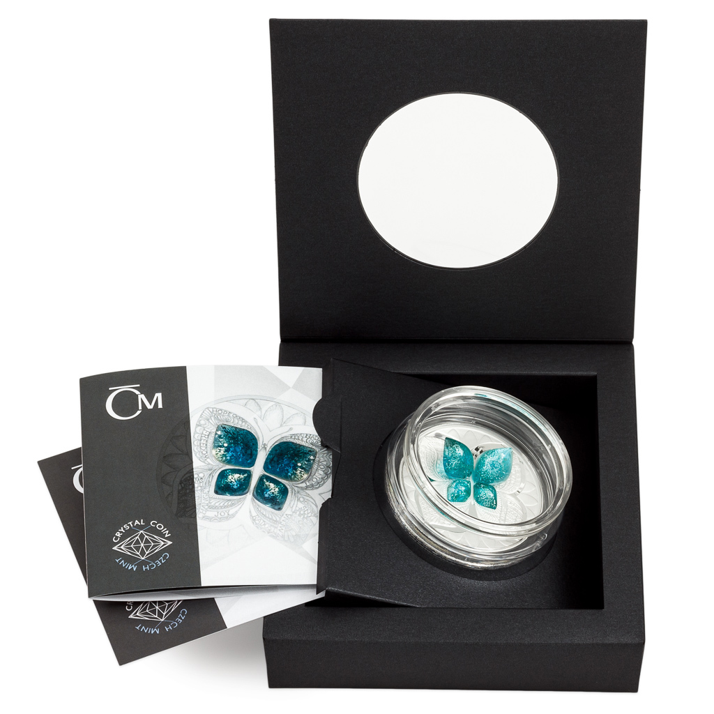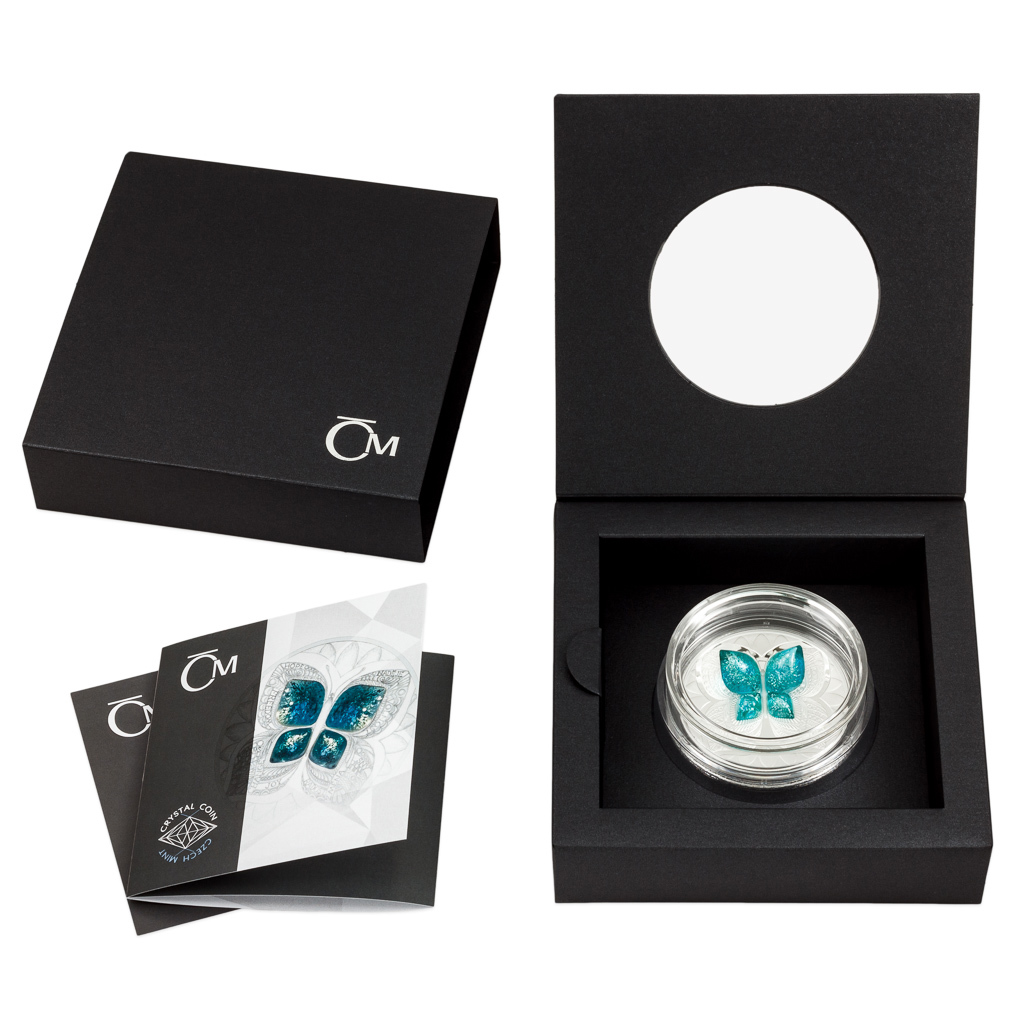 Unikátní stříbrné mince s českým křišťálem „Crystal Coin“ jsou výsledkem spojení tradičních jabloneckých řemesel – mincovnictví České mincovny a sklářství společnosti Preciosa. Oblíbený motiv motýla se na nich objevuje již potřetí, opět s novým designem.