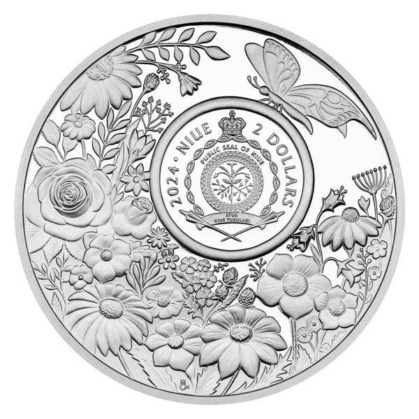 Reverzní strana mince, která je dílem medailérky Petry Brodské, DiS., předkládá motýla, jehož křídla jsou kombinací raženého reliéfu a českého křišťálu. Součástí propracované mozaiky jsou česko-anglické nápisy – NADĚJE, HOPE, VOLNOST, FREEDOM, SNY, DREAMS, ZMĚNA, CHANGE, RADOST, JOY. Motýla najdete i na averzní straně mince, kde je součástí rozkvetlé zahrady. Protože mince České mincovny vycházejí v licenci zahraničního emitenta, kterým je ostrov Niue, nese averz ještě jeho nezbytné atributy – státní znak, nominální hodnotu 2 DOLLARS (NZD) a letopočet emise 2024.