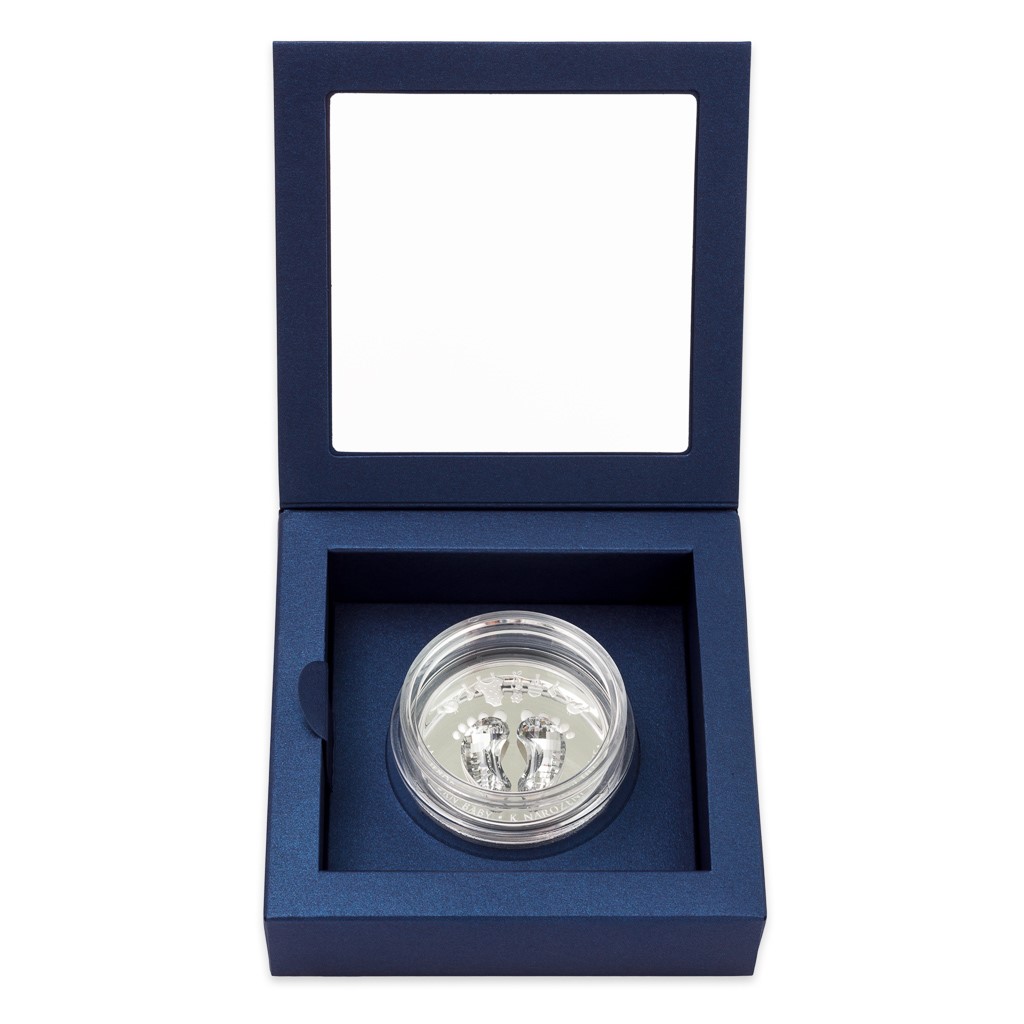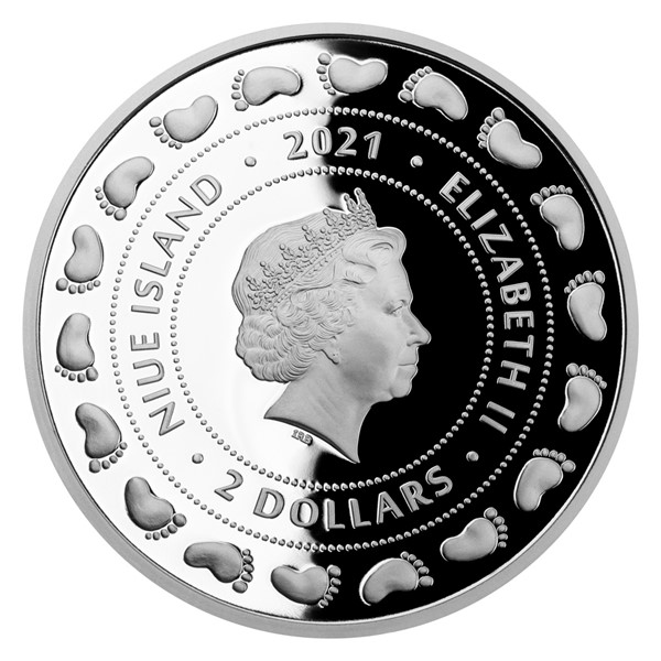 Reverzní strana pamětní mince předkládá kombinaci raženého reliéfu, broušeného českého křišťálu a tradiční symboliky. Nožičky novorozeného miminka jsou drobné, křehké a roztomilé – rostou jako z vody a připomínají, jak bylo děťátko malinké, když si ho rodiče přinesli domů. V podání medailérky Ireny Hradecké, DiS., nožičky doplňují ještě další dětské motivy spolu s dvoujazyčným opisem NEWBORN BABY – K NAROZENÍ DÍTĚTE. Protože mince České mincovny vycházejí v licenci zahraničního emitenta, kterým je ostrov Niue, nese jejich averzní strana jeho nezbytné atributy – nominální hodnotu 2 DOLLARS (NZD), rok emise 2021, jméno Alžběty II. a portrét královny, který je obklopen řadou dalších otisků nožiček.