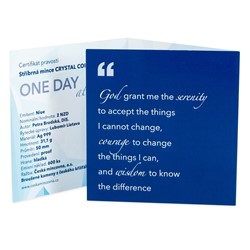 Součástí dárkového balení, které rovněž slouží jako praktický rámeček pro vystavení mince, je trojjazyčný certifikát pravosti. Obsahuje citát Reinholda Niebuhra v angličtině, jehož překlad zní: „Bože, dej mi KLID, abych přijímal věci, které změnit nemohu, ODVAHU, abych měnil věci, které měnit mohu, a MOUDROST, abych je uměl od sebe odlišit.“
