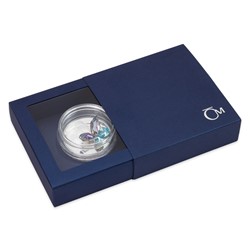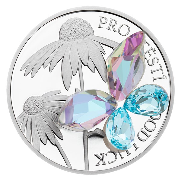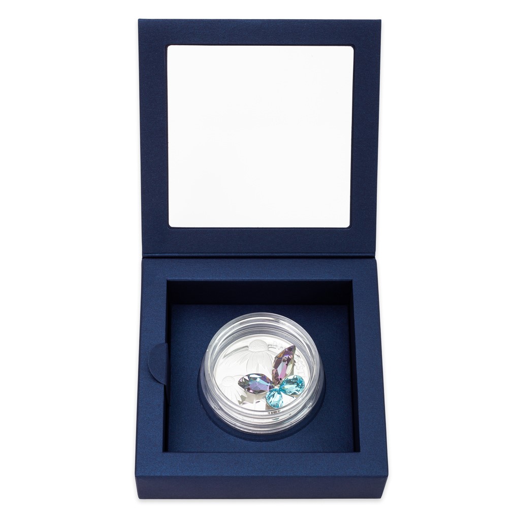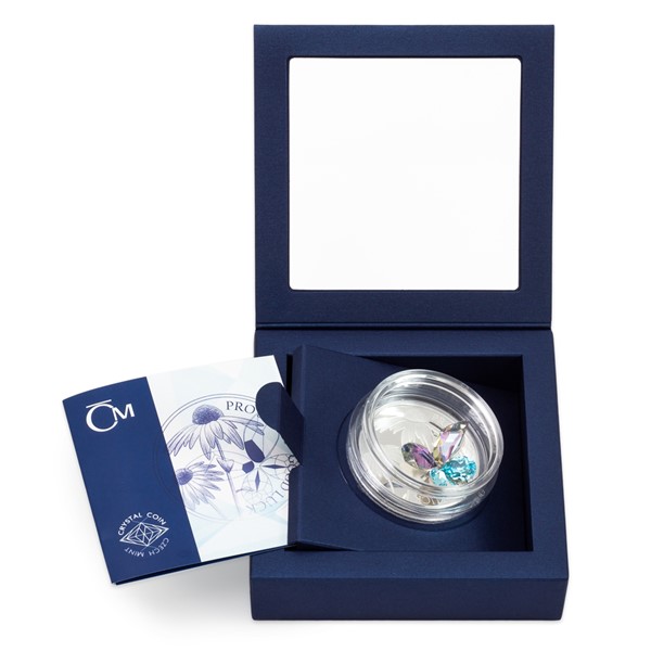 Unikátní stříbrné mince s broušeným českým křišťálem jsou výsledkem spojení tradičních jabloneckých řemesel – medailérství České mincovny a sklářství společnosti Preciosa. Motiv motýla pro štěstí se už na minci z řady Crystal Coin objevil, ale emise byla rychle vyprodána, a tak vychází její reedice s novým designem.