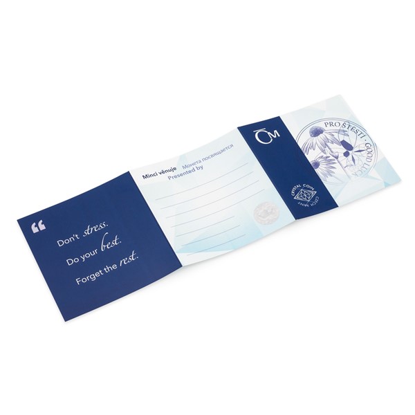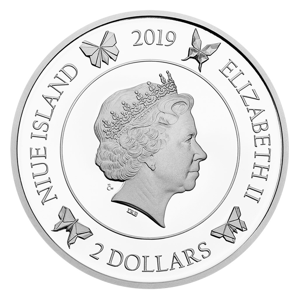 Reverzní strana dárkové mince předkládá kombinaci raženého reliéfu a broušeného českého křišťálu. V podání medailérky Ireny Hradecké, DiS., poletuje skleněný motýl okolo stříbrné květiny. Kompozici dotváří ještě česko-anglický opis PRO ŠTĚSTÍ – GOOD LUCK. Protože mince České mincovny vycházejí v licenci zahraničního emitenta, kterým je ostrov Niue, nese jejich averzní strana jeho nezbytné atributy – nominální hodnotu 2 DOLLARS (NZD), rok emise 2019, jméno Alžběty II. a portrét královny, který je obklopen čtveřicí motýlů.