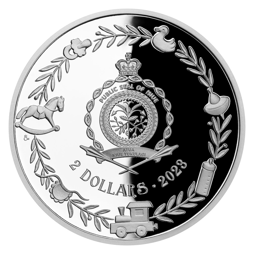 Reverzní strana pamětní mince, která je dílem medailérky Petry Brodské, DiS., předkládá kombinaci raženého reliéfu, českého křišťálu a tradiční symboliky. Miminko zavinuté do šátku doprovází nejen čáp, ale také vrána, která podle některých pověstí nosí rodičům holčičky. Uzlíček štěstí nadnášejí balónky, z nichž jeden je tvořen křišťálovým kamenem. Protože mince České mincovny vycházejí v licenci zahraničního emitenta, kterým je ostrov Niue, nese jejich averzní strana jeho nezbytné atributy – nominální hodnotu 2 DOLLARS (NZD), rok emise 2023 a státní znak, který je obklopen řadou dětských motivů.