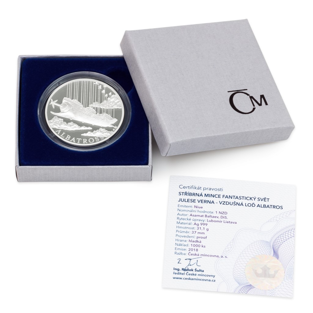 Reverzní straně mince, která je opět dílem nadaného medailéra Asmata Baltaeva, DiS., dominuje ALBATROS – ne nepodobný námořní lodi – plující mezi mraky. Averzní strana mince je pak přehlídkou všech vynálezů z minisérie „Fantastický svět Julese Verna“ – najdete na ní nejen vzdušnou loď Albatros, ale také ponorku Nautilus, mechanického parního slona a měsíční dělo Columbiad. To vše je poutavě zkombinováno s atributy emitenta mince, kterým je ostrov Niue. Protože mince České mincovny vycházejí v této zahraniční licenci, nesou profil a jméno panovnice Alžběty II., letopočet emise 2018 a nominální hodnotu 1 DOLLAR (NZD).