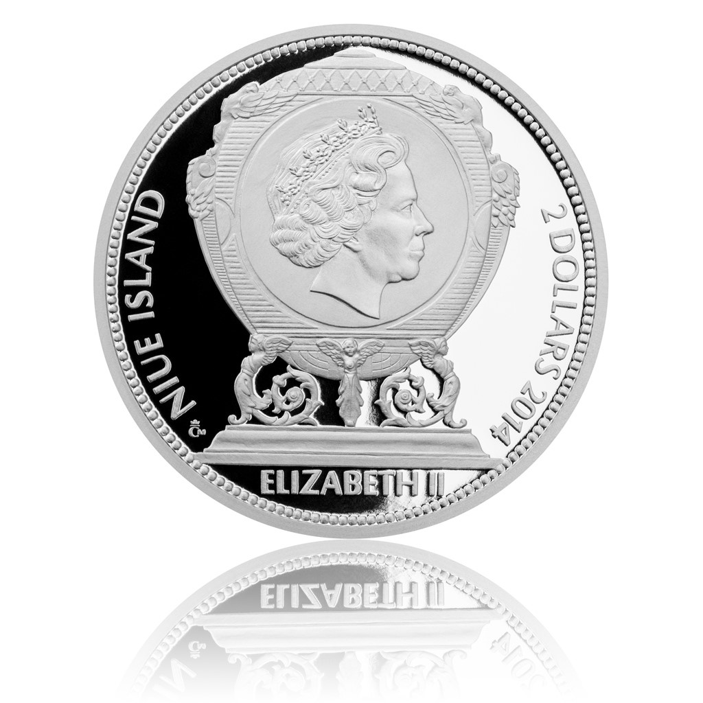 Právě tento prvek zdobí averz stříbrné mince, která je věnována památce Gustava Fabergého. Jedná se o plastiku klenotu v podobě vejce. Tu pro Českou mincovnu připravil výjimečně talentovaný medailér Asamat Baltaev. Motiv lícní strany doplňuje podobizna královny Alžběty II. a nominál 2 NZD. Na reverzu se nachází portrét Gustava Fabergého, spolu s jeho jménem a životopisnými daty, který Baltaev zpracoval na základě předlohy ruského malíře A. I. Perevyška.