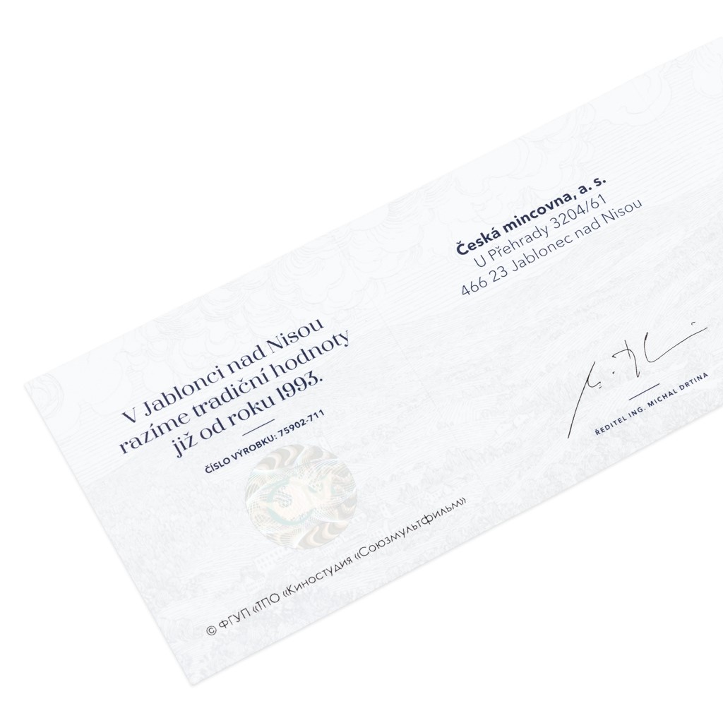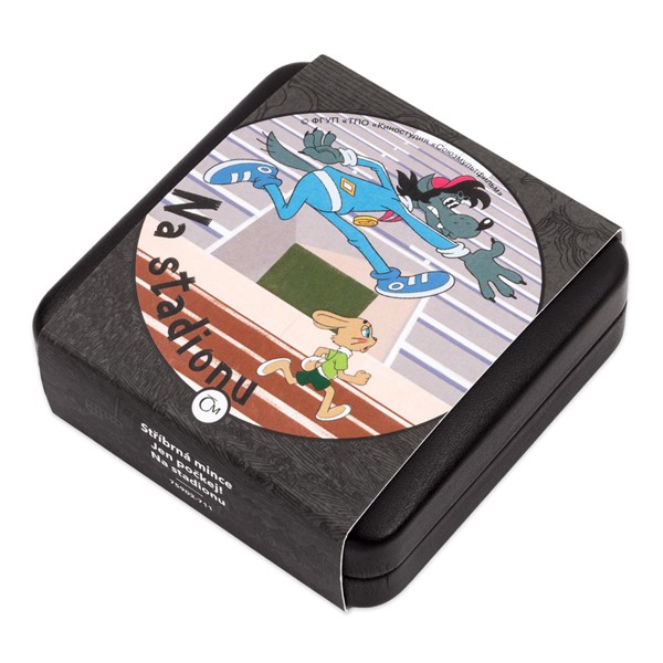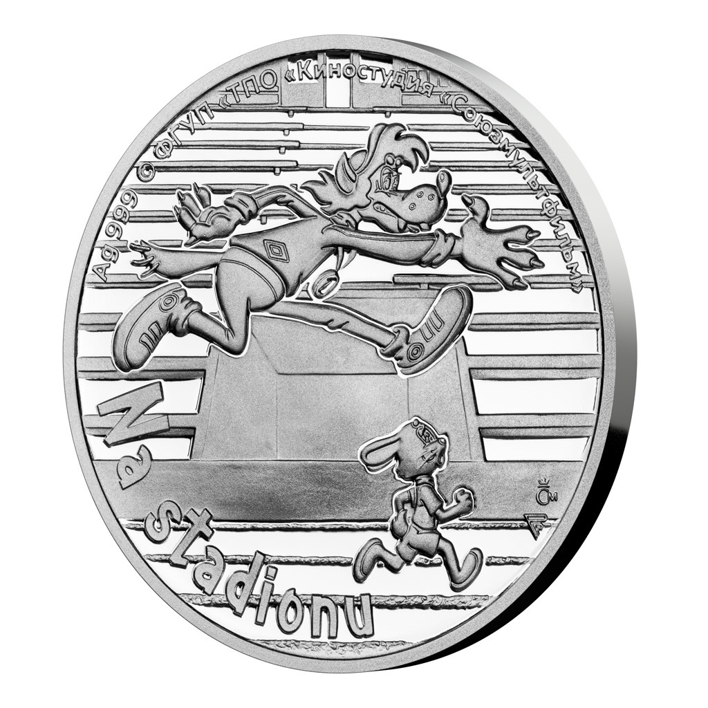 Třetí stříbrná mince České mincovny z pětidílné minisérie, která je inspirována legendární sovětskou groteskou Jen počkej!, je věnována epizodě s názvem Na stadionu.