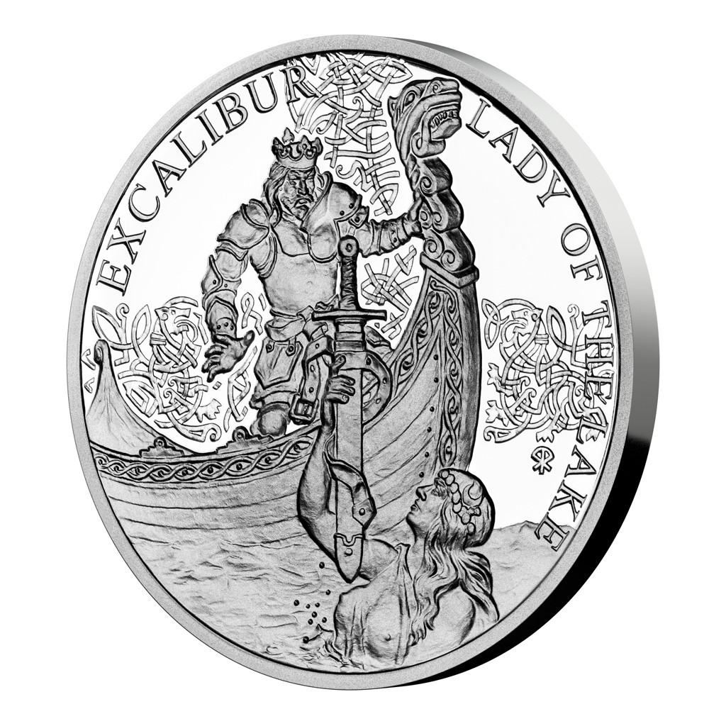 Druhá stříbrná mince České mincovny ze čtyřdílné minisérie inspirované legendou o králi Artušovi připomíná příběh o Jezerní paní a meči jménem Excalibur.