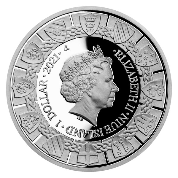 Medailér Asamat Baltaev, DiS., který je autorem mince, vyobrazil na reverzní straně Merlina v době jeho největší slávy. Důstojný muž s plnovousem vládne kouzelnou holí a v pozadí za ním bojují dva draci, kteří symbolizují konflikt Keltů se Sasy. V návaznosti na předchozí minci cyklu je na pozadí naznačen kříž, který v kombinaci s kruhovým obvodem mince odkazuje na keltsko-křesťanský původ legendy. Kompozici reverzu dotváří anglický opis MERLIN – DRAGONS. Averzní strana mince pak představuje bájný kulatý stůl a je poseta erby Artušových rytířů. Protože mince České mincovny vycházejí v zahraniční licenci ostrova Niue, nesou na averzu ještě jméno a portrét královny Alžběty II., nominální hodnotu 1 DOLLAR (NZD) a rok emise 2021.