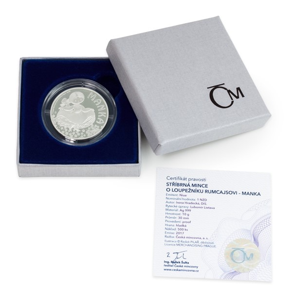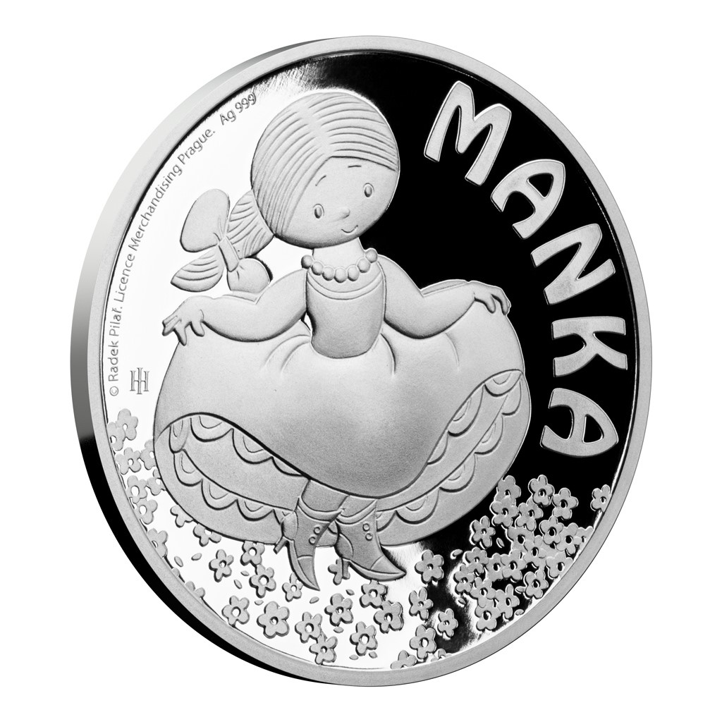 Na reverzní straně mince se Manka prochází mezi květinami rostoucími na řáholecké mýtině – má vysoké botky, širokou červenou sukni, plavé vlasy spletené do copu a veselý úsměv. Reliéf zpracovala podle originální kresby ilustrátora Radka Pilaře nadaná medailérka Irena Hradecká, DiS. Na averzní straně se pak nacházejí profil a jméno královny Alžběty II., letopočet emise 2017 a nominální hodnota 1 DOLLAR (NZD) – tedy nezbytné náležitosti ostrova Niue, který České mincovně umožňuje razit vlastní pamětní mince.