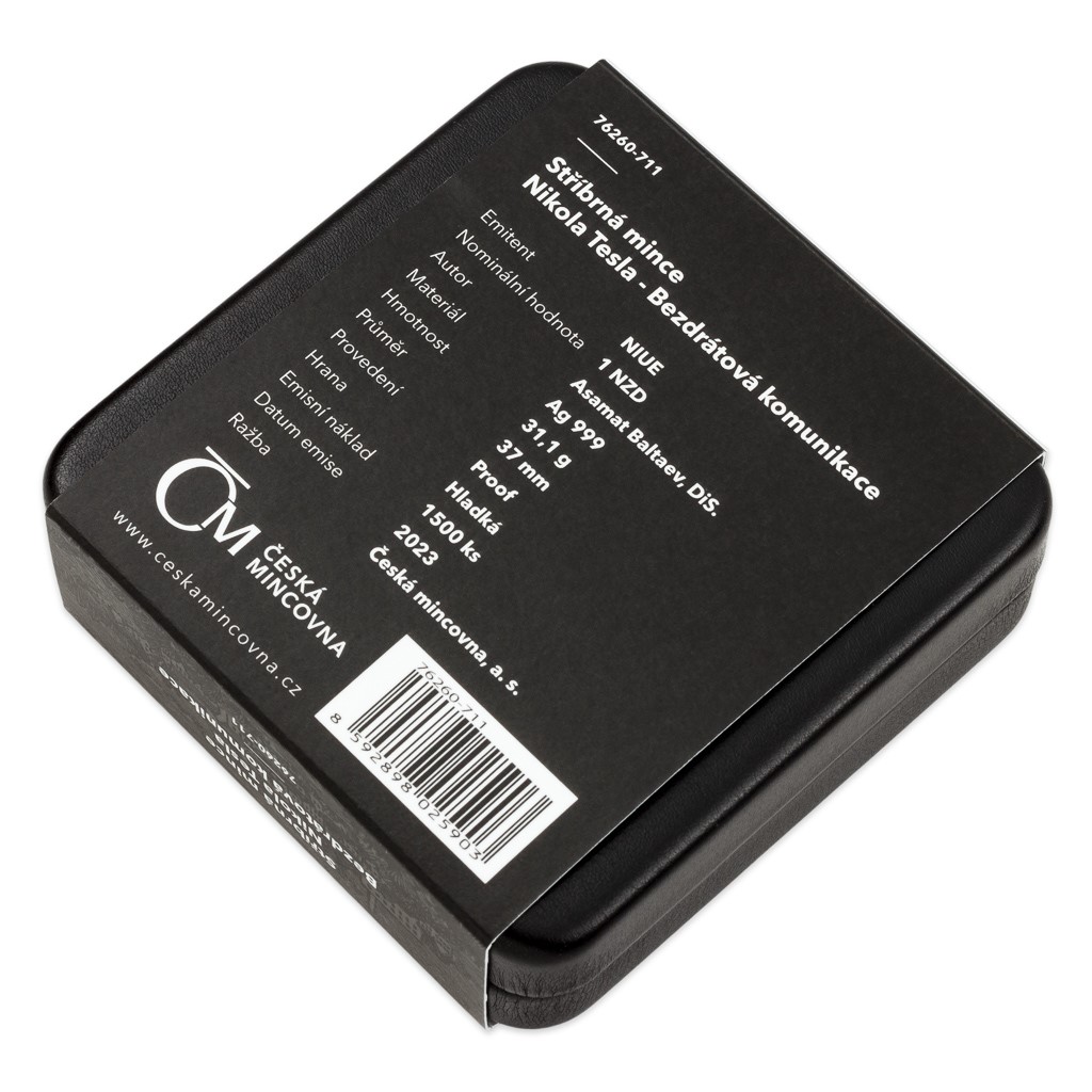 Medailér Asamat Baltaev, DiS., věnoval reverzní stranu mince portrétu Nikoly Tesly, jenž shlíží na Wardenclyffskou věž, kterou zkonstruoval za účelem bezdrátového přenosu informací a energie. Kompozici dotvářejí ještě elektrické výboje a anglický nápis WIRELESS COMMUNICATION (bezdrátová komunikace). Blesky najdete také na averzní straně mince, která je společná celé minisérii. Protože licenci k vydávání pamětních mincí České mincovny poskytuje tichomořský ostrov Niue, averzní strana nese ještě jeho nezbytné atributy – státní znak, nominální hodnotu 1 DOLLAR (NZD) a rok vydání 2023.