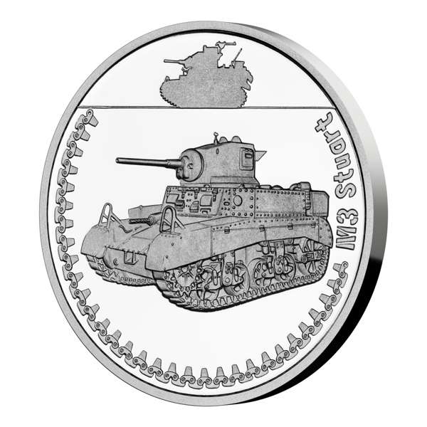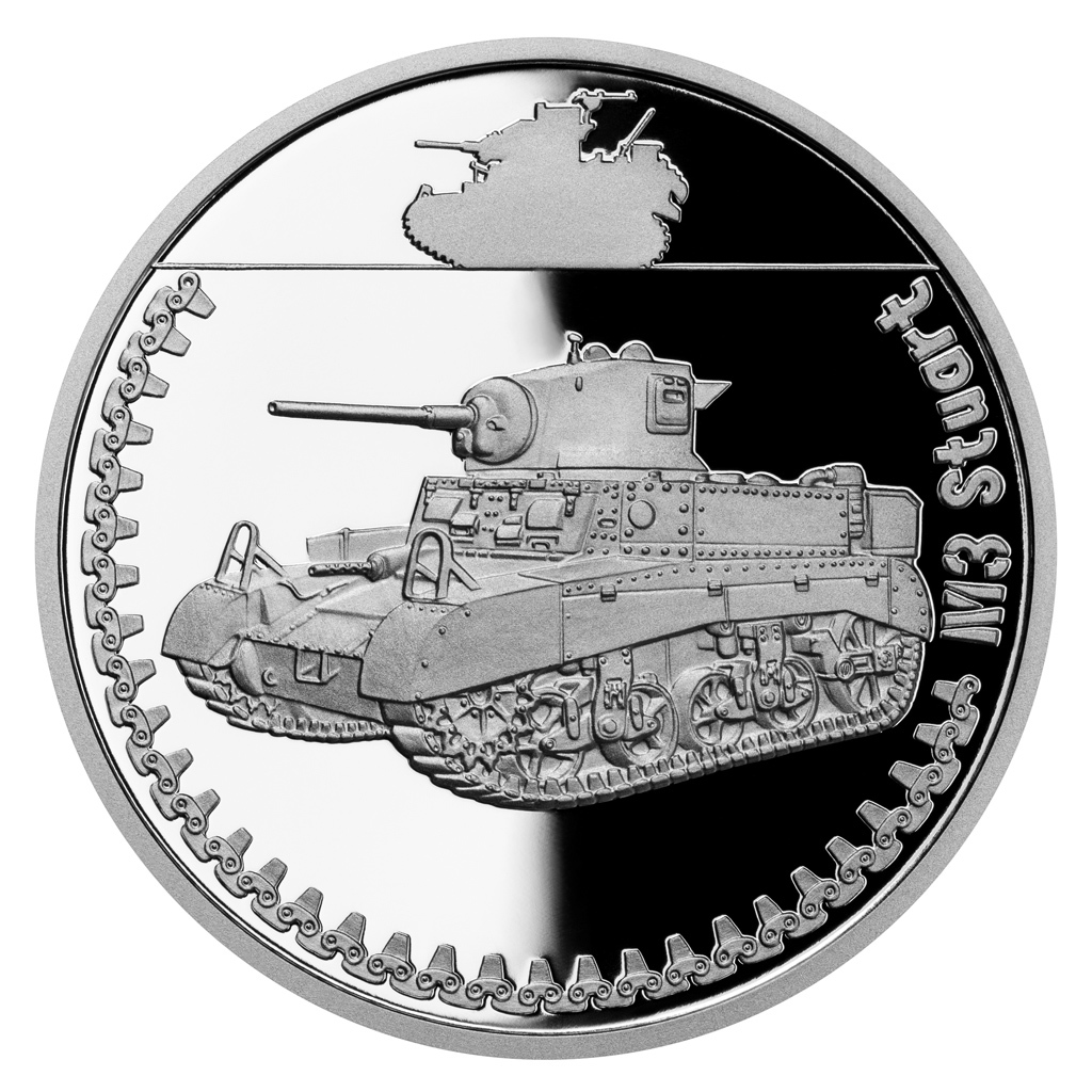 Na sedmé stříbrné minci České mincovny z cyklu Obrněná technika se objevuje americký tank M3 Stuart, který sloužil za druhé světové války.
