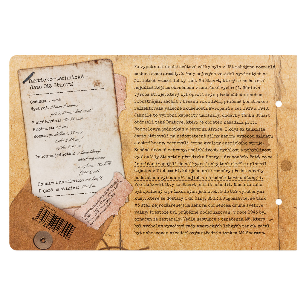 Stroj s označením M3 Stuart byl prvním tankem americké výroby, který zasáhl do bojů druhé světové války. Jeho sériová výroba začala v březnu roku 1941, přičemž robustní konstrukce reflektovala válečné zkušenosti Evropanů z let 1939 a 1940. Křest ohněm Stuart prodělal v severní Africe, kde ho Britové nasadili proti obávaným jednotkám Erwina Rommela. Poté, co se do války aktivně zapojili i sami Američané, se lehký tank skvěle uplatnil zejména v Tichomoří, kde jeho malé rozměry představovaly podstatnou výhodu při bojích v náročném terénu džunglí. Pro tankové bitvy se Stuart příliš nehodil – namísto toho byl oblíbený u průzkumných jednotek. Přestože si tankisté často stěžovali na nedostatečně silný kanon, vysokou siluetu a ostré hrany, oceňovali značnou úroveň ochrany, spolehlivost, rychlost a pohyblivost, kterou jim Stuart poskytoval. S 13 859 vyrobenými kusy, které se dostaly i do Číny, SSSR a Jugoslávie, se tank M3 stal nejrozšířenějším lehkým obrněncem druhé světové války. Přestože byl průběžně modernizován, v roce 1943 byl označen za zastaralý. Vedle nástupce s označením M5, který byl vrcholem vývojové řady amerických lehkých tanků, začal být nahrazován víceúčelovým středním tankem M4 Sherman…