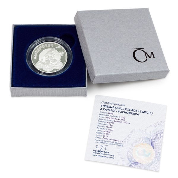 Pohádkové mince České mincovny pro malé i velké sběratele tradičně připravuje nadaná medailérka Irena Hradecká, DiS. Na reverzní straně najdete bezelstného Vochomůrku – toho menšího, baculatějšího, naivnějšího a možná i trochu bojácnějšího mužíčka –, který sedí na podušce z listí a pozoruje poletujícího motýla. Mince České mincovny vycházejí v zahraniční licenci ostrova Niue, a jejich averzní strana proto nese nezbytné atributy tohoto emitenta – jméno a portrét královny Alžběty II., rok emise 2018 a nominální hodnotu 1 DOLLAR (NZD).
