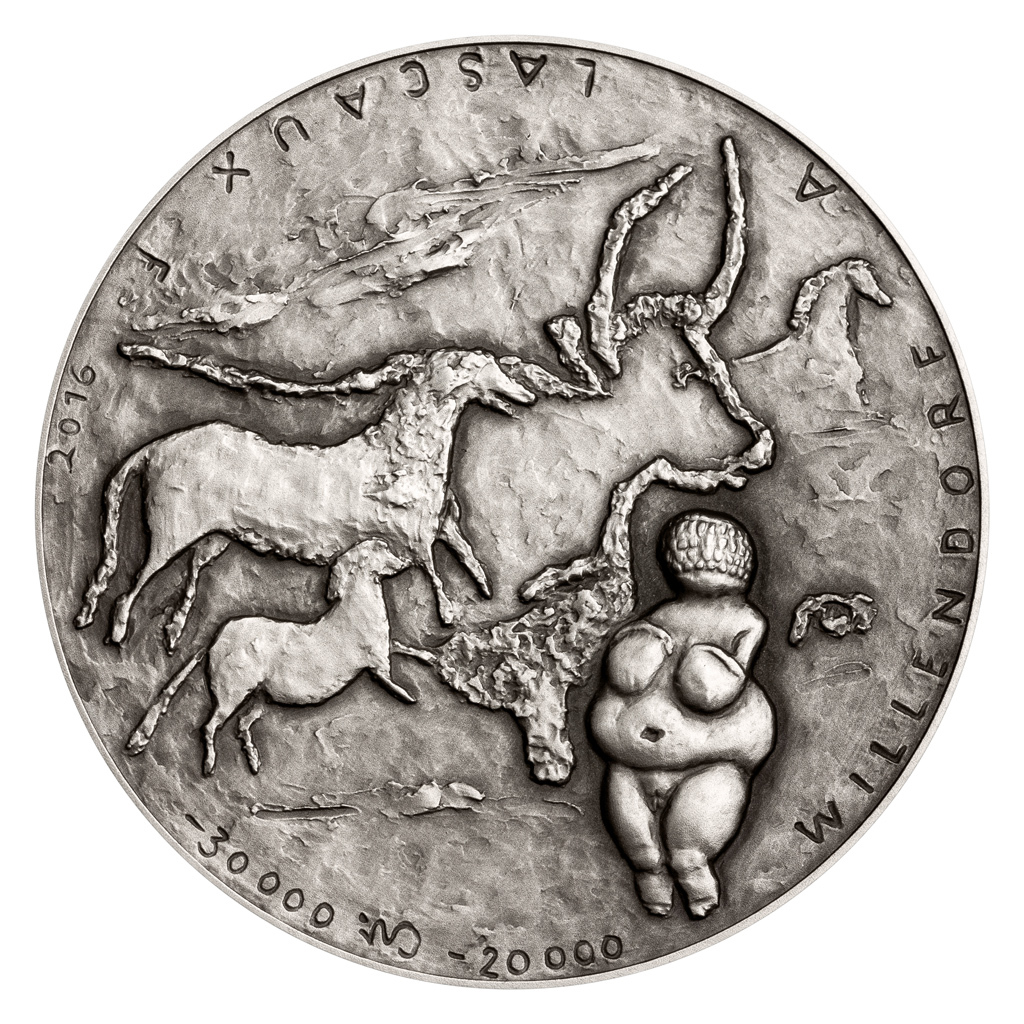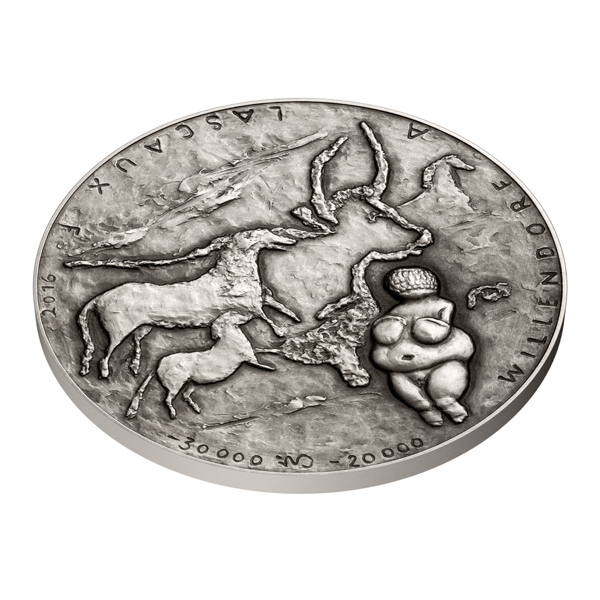 V reliéfu páté stříbrné mince z cyklu, který představuje poklady starých civilizací, se objevují hned dvě pravěké pamětihodnosti – Willendorfská venuše a jeskynní malby z Lascaux.