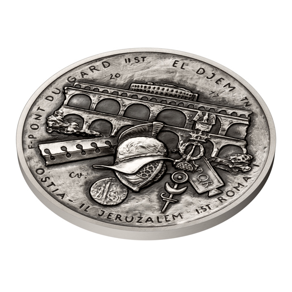 V reliéfu osmé stříbrné mince z cyklu, který představuje poklady starých civilizací, se objevuje řada pamětihodností starověkého Říma.