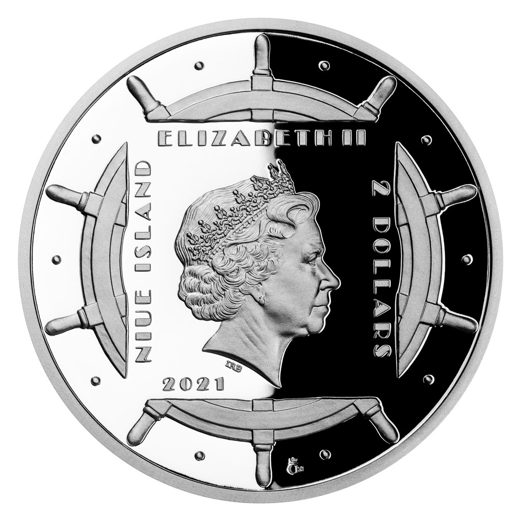 Tyto dobyvatele – od pěšího polárníka přes vzducholoď po atomový ledoborec – připomíná reverzní strana mince, která je dílem medailéra Luboše Charváta. V bohatém reliéfu nechybí ani arktický ledovec a lední medvěd. Kompozici reverzu dotváří směrová růžice a nápis DOBÝVÁNÍ SEVERNÍHO PÓLU. Averzní strana nese kormidelní kolo coby symbol objevných cest. Protože mince České mincovny vycházejí v zahraniční licenci ostrova Niue, předkládají na averzu ještě jméno a portrét královny Alžběty II., nominální hodnotu 2 DOLLARS (NZD) a rok emise 2021.