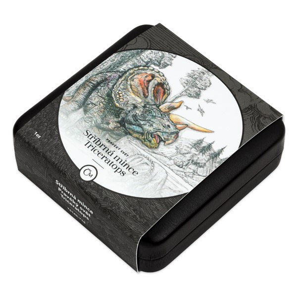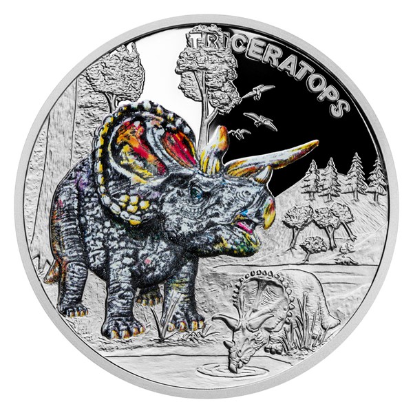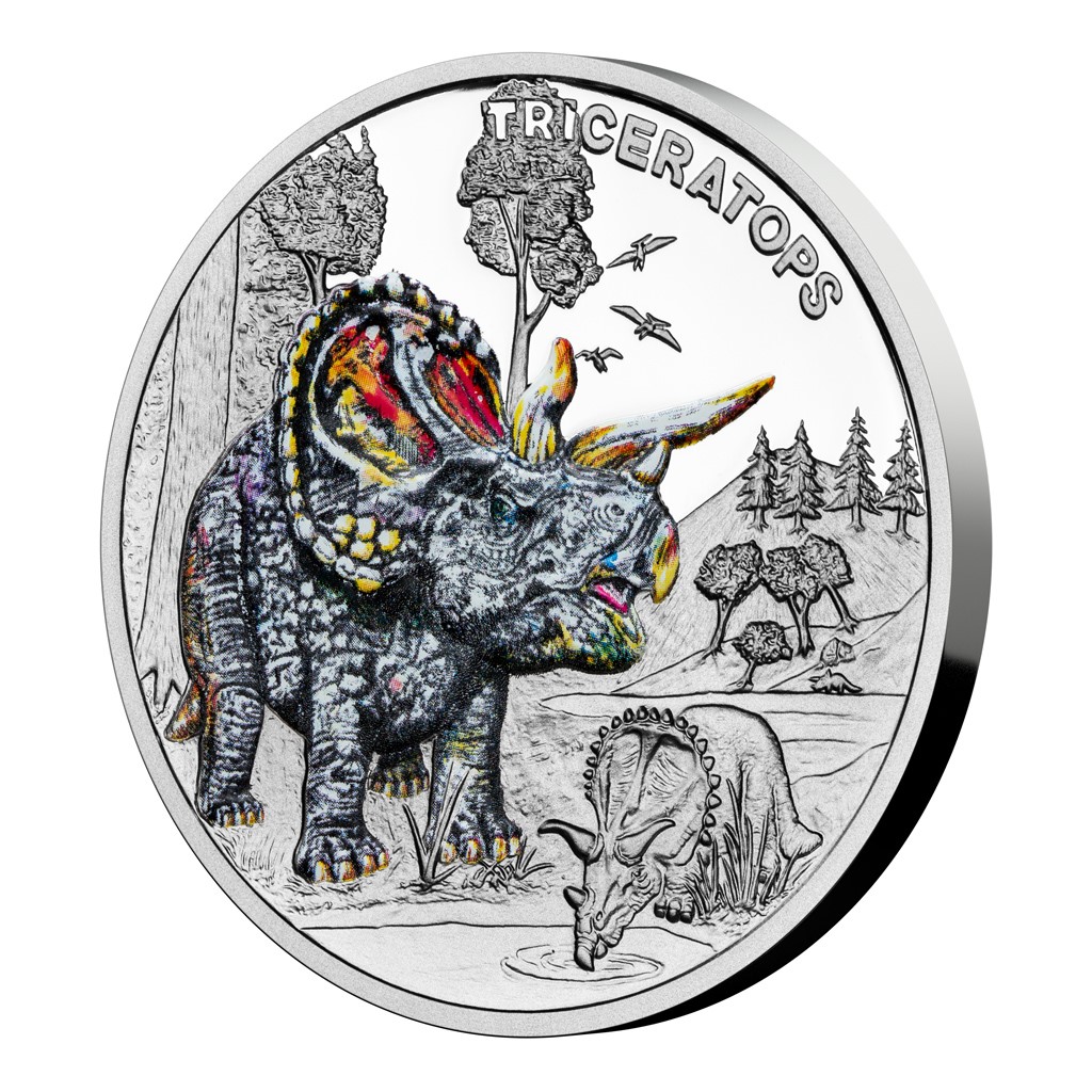 Druhým druhohorním ještěrem, který se objevuje na stříbrné minci České mincovny z cyklu Pravěký svět, je triceratops.