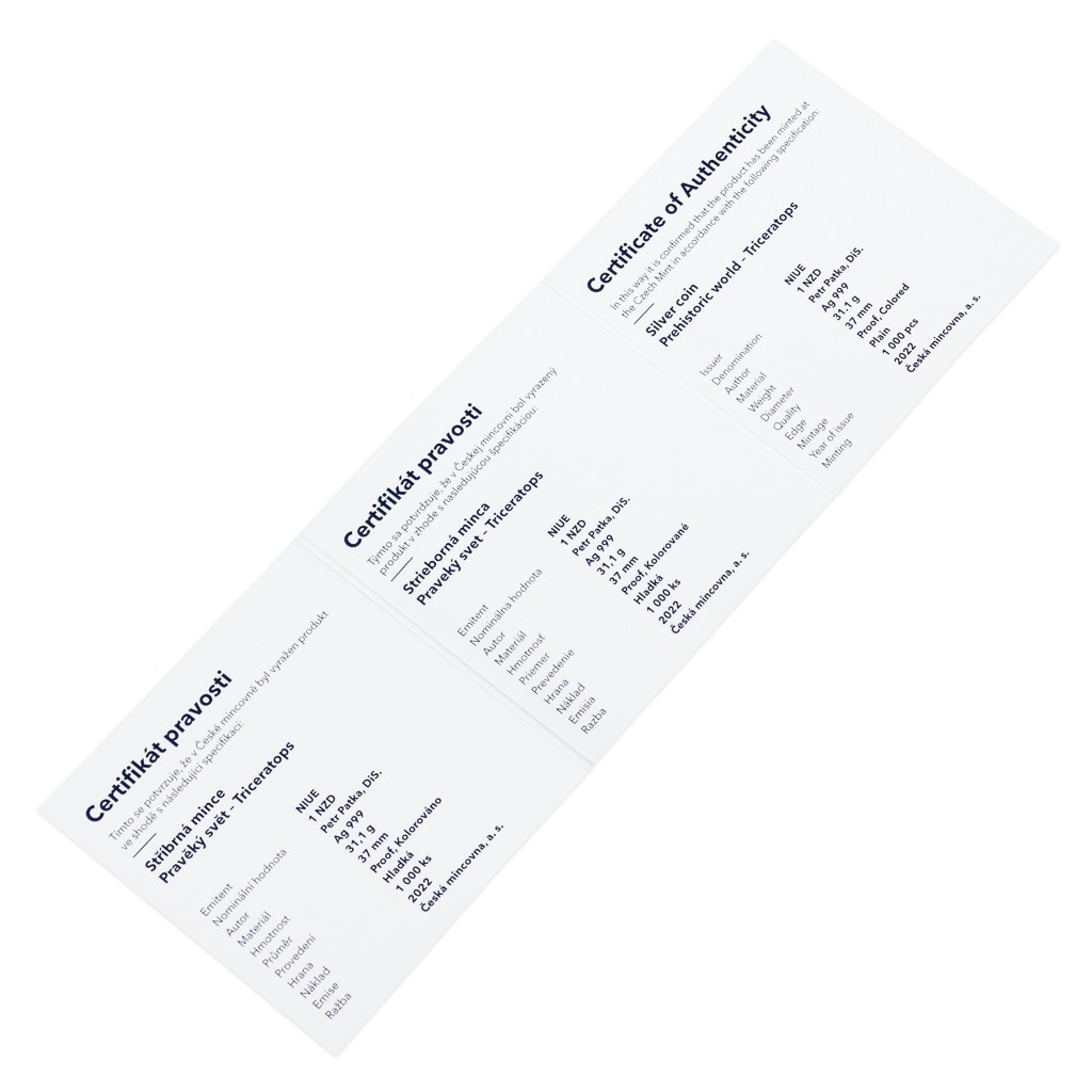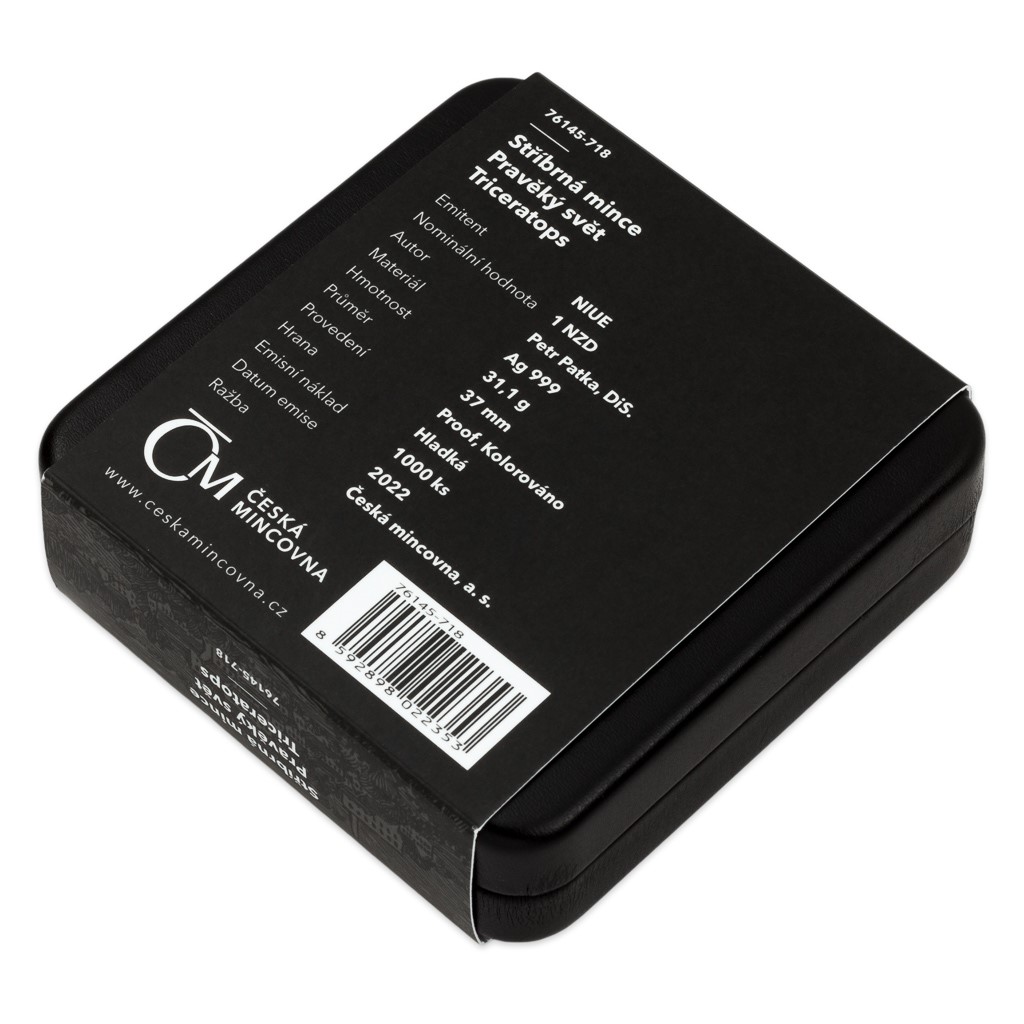 Reverzní stranu mince věnoval medailér Petr Patka, DiS., vyobrazení majestátního triceratopse v živých barvách, kterých bylo docíleno pomocí technologie kolorování. Jako předloha nebyly použity fotografie nebo počítačová grafika – autor mince vytvořil originální malbu. V raženém reliéfu je patrná druhohorní divočina – napajedlo, kam s dospělým dinosaurem přišlo mládě. Kompozici reverzu uzavírá opis TRICERATOPS. Averzní strana mince, která je společná celému cyklu, pak předkládá zkamenělou kostru tyrannosaura a anglický opis PREHISTORIC WORLD (Pravěký svět). Protože licenci k vydávání pamětních mincí České mincovny poskytuje tichomořský ostrov Niue, nese averz ještě jeho nezbytné atributy – státní znak, nominální hodnotu 1 DOLLAR (NZD) a rok vydání 2022.
