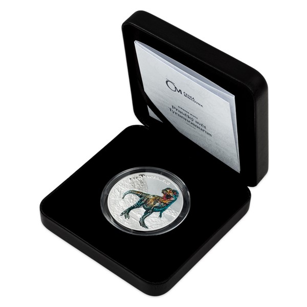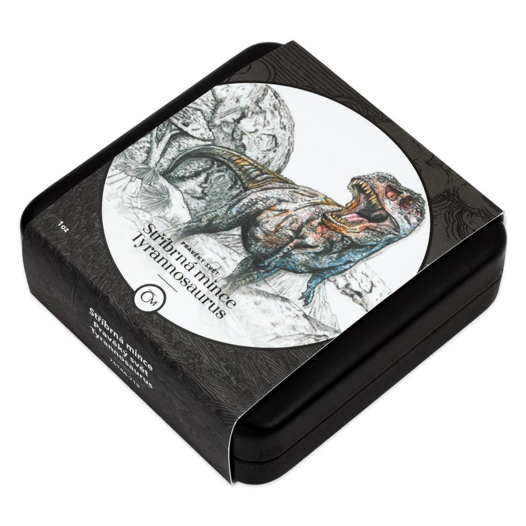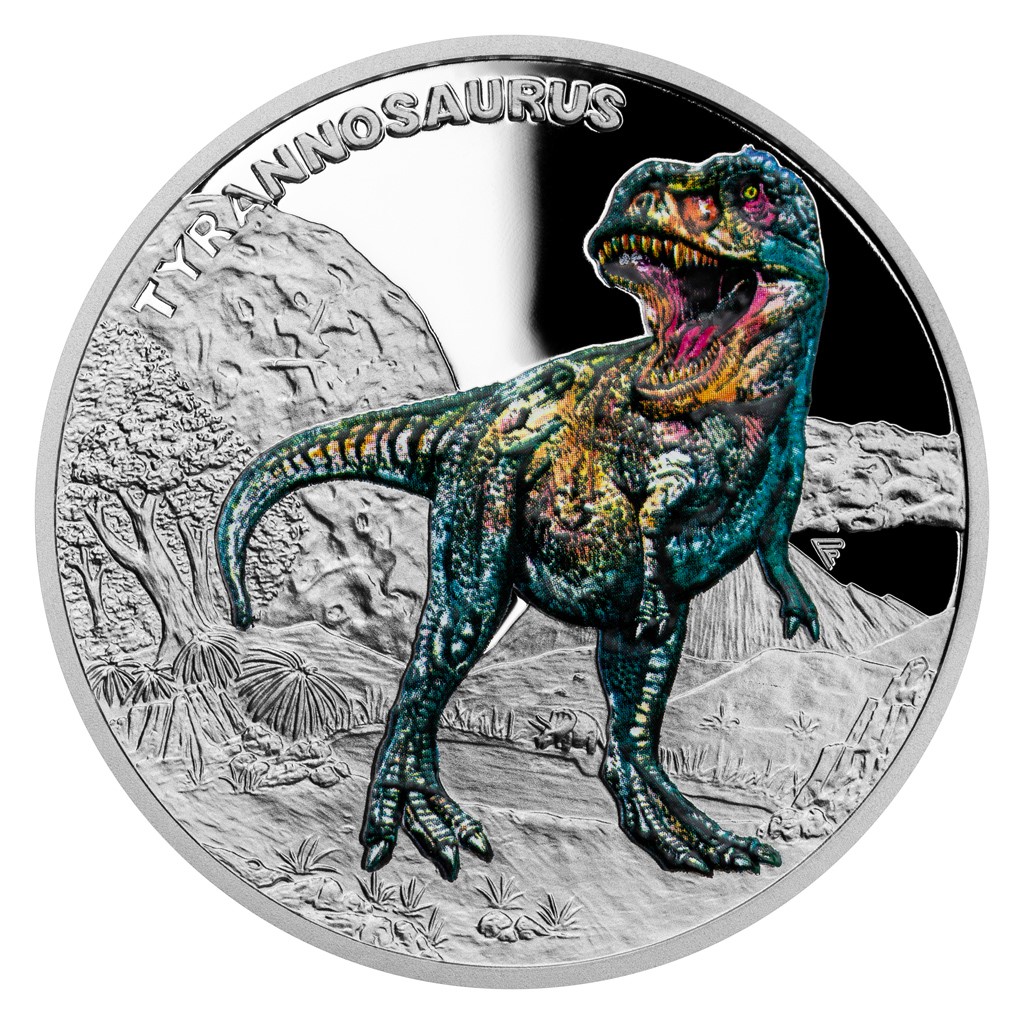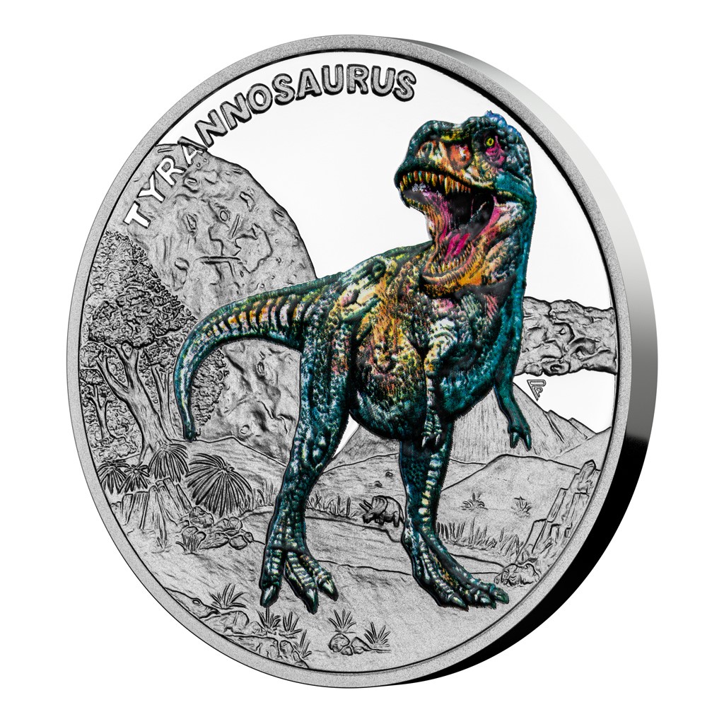 Prvním druhohorním ještěrem, který se objevuje na stříbrné minci České mincovny z cyklu Pravěký svět, je tyrannosaurus.