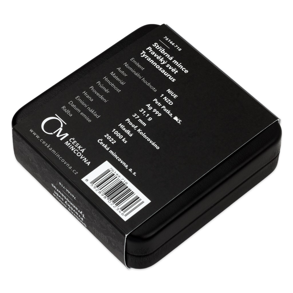 Reverzní stranu mince věnoval medailér Petr Patka, DiS., vyobrazení majestátního tyrannosaura v živých barvách, kterých bylo docíleno pomocí technologie kolorování. Jako předloha nebyly použity fotografie nebo počítačová grafika – autor mince vytvořil originální malbu. V raženém reliéfu je patrná druhohorní divočina a kompozici uzavírá opis TYRANNOSAURUS. Averzní strana mince předkládá tyrannosaurovu zkamenělou kostru a anglický opis PREHISTORIC WORLD (Pravěký svět). Protože licenci k vydávání pamětních mincí České mincovny poskytuje tichomořský ostrov Niue, nese averz ještě jeho nezbytné atributy – státní znak, nominální hodnotu 1 DOLLAR (NZD) a rok vydání 2022.