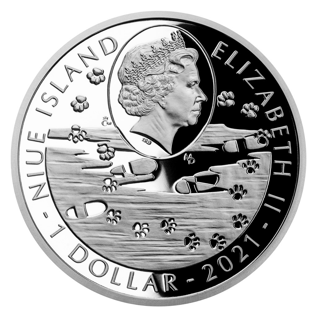 Reverzní strana mince, která je dílem medailéra MgA. Martina Daška, nese hned dvě vyobrazení hladkosrstého jezevčíka. První je kolorované, a tak dává vyniknout červenohnědé srsti psa. Druhé je reliéfní a norníka předkládá ve společnosti myslivecké symboliky – pušky, klobouku a ulovené lišky. Kompozici dotváří dvojjazyčný opis JEZEVČÍK – DACHSHUND. Protože mince České mincovny vycházejí v zahraniční licenci ostrova Niue, nesou na averzní straně jméno a portrét královny Alžběty II., nominální hodnotu 1 DOLLAR (NZD) a rok emise 2021. Tyto atributy jsou doplněny řadou stop – lidských a psích.