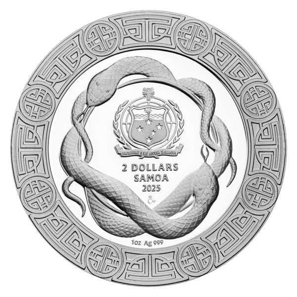 Medailérka Petra Brodská, DiS., věnovala reverzní stranu mince vyobrazení hada, které doplnila příslušným čínským symbolem a anglickým opisem YEAR OF THE SNAKE (rok hada). Do dekoru, který plaza obklopuje, zakomponovala letopočty 20. a 21. století, na které připadá rok hada. Protože mince České mincovny vycházejí v zahraniční licenci státu Samoa, nesou na averzní straně jeho státní znak, letopočet emise 2025 a nominální hodnotu 2 DOLLARS (WST). Kompozici averzu dotvářejí ještě tradiční čínští draci.