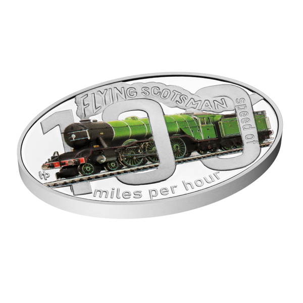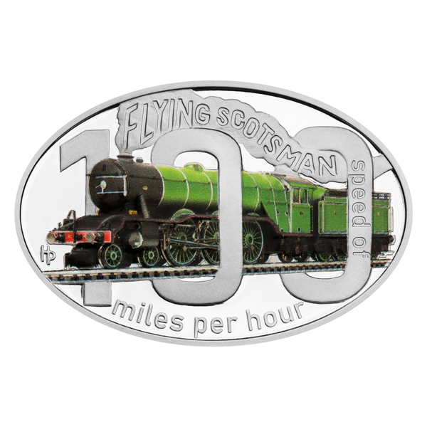 Reverzní strana mince, která je dílem medailéra Mgr. Petra Horáka, předkládá lokomotivu projíždějící nulami v nápisu SPEED OF 100 MILES PER HOUR (rychlost 100 mil za hodinu). Do kouře, který se line z komína, je zakomponován její název FLYING SCOTSMAN. Charakteristický zelený nátěr lokomotivy byl vytvořen s pomocí technologie kolorování. Averzní strana mince, která je společná celému cyklu, pak předkládá železniční koleje a tunel. Protože mince České mincovny vycházejí v zahraniční licenci ostrova Niue, nesou na averzní straně ještě jeho státní znak, nominální hodnotu 1 DOLLAR (NZD) a rok emise 2024.