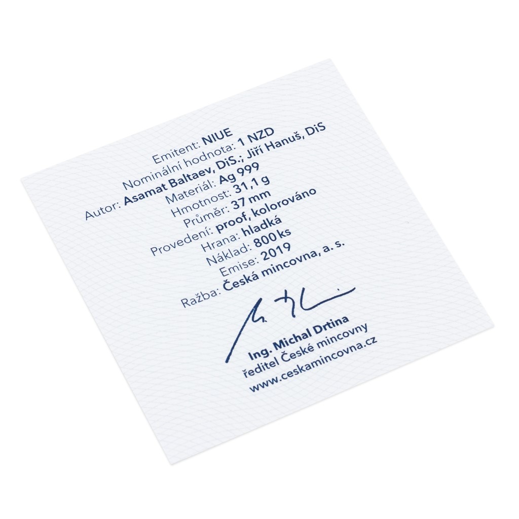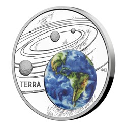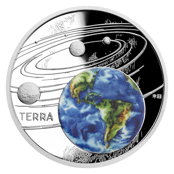 Na reverzní straně mince, která je dílem autorského dua Asamat Baltaev, DiS., a Jiří Hanuš, DiS., najdete kolorované vyobrazení Země. Ražený reliéf pak předkládá další planety kroužící okolo Slunce, jejich oběžné dráhy a latinské jméno Země TERRA. Jako předloha pro kolorování nebyly použity fotografie nebo počítačová grafika – autoři mincí vytvořili originální akvarelové malby. Mincovní plocha ražeb se vyznačuje speciální úpravou – kombinací proofování, pískování a lejzrování razidel bylo docíleno nového efektu, který jsme nazvali „měsíční prach“. Averzní strana mince je věnována vyobrazení celé sluneční soustavy a předkládá astronomické symboly jednotlivých planet. Ve středu soustavy najdete portrét Alžběty II., který je spolu se jménem královny, letopočtem emise 2019 a nominální hodnotou 1 DOLLAR (NZD) nezbytným atributem emitenta mince. Tím je tichomořský ostrov Niue, který České mincovně poskytuje zahraniční licenci k ražbě vlastních pamětních mincí.