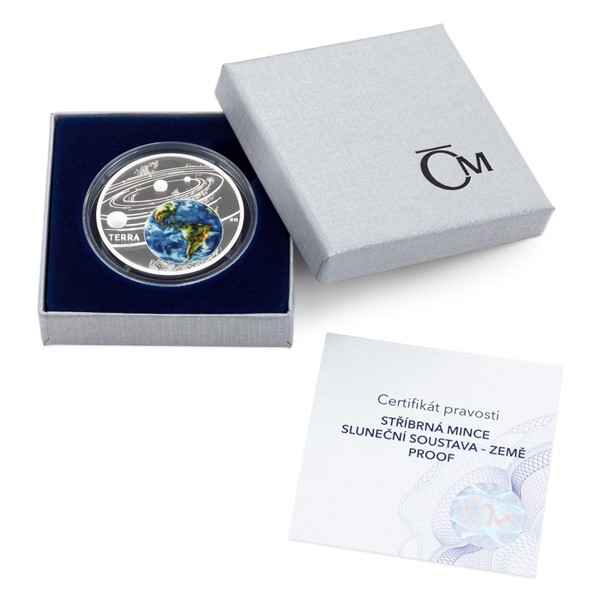 Po Slunci a Měsíci, které se střídají na naší obloze, se na stříbrné minci zkrášlené kolorováním ze sběratelského cyklu Sluneční soustava objevuje planeta Země.
