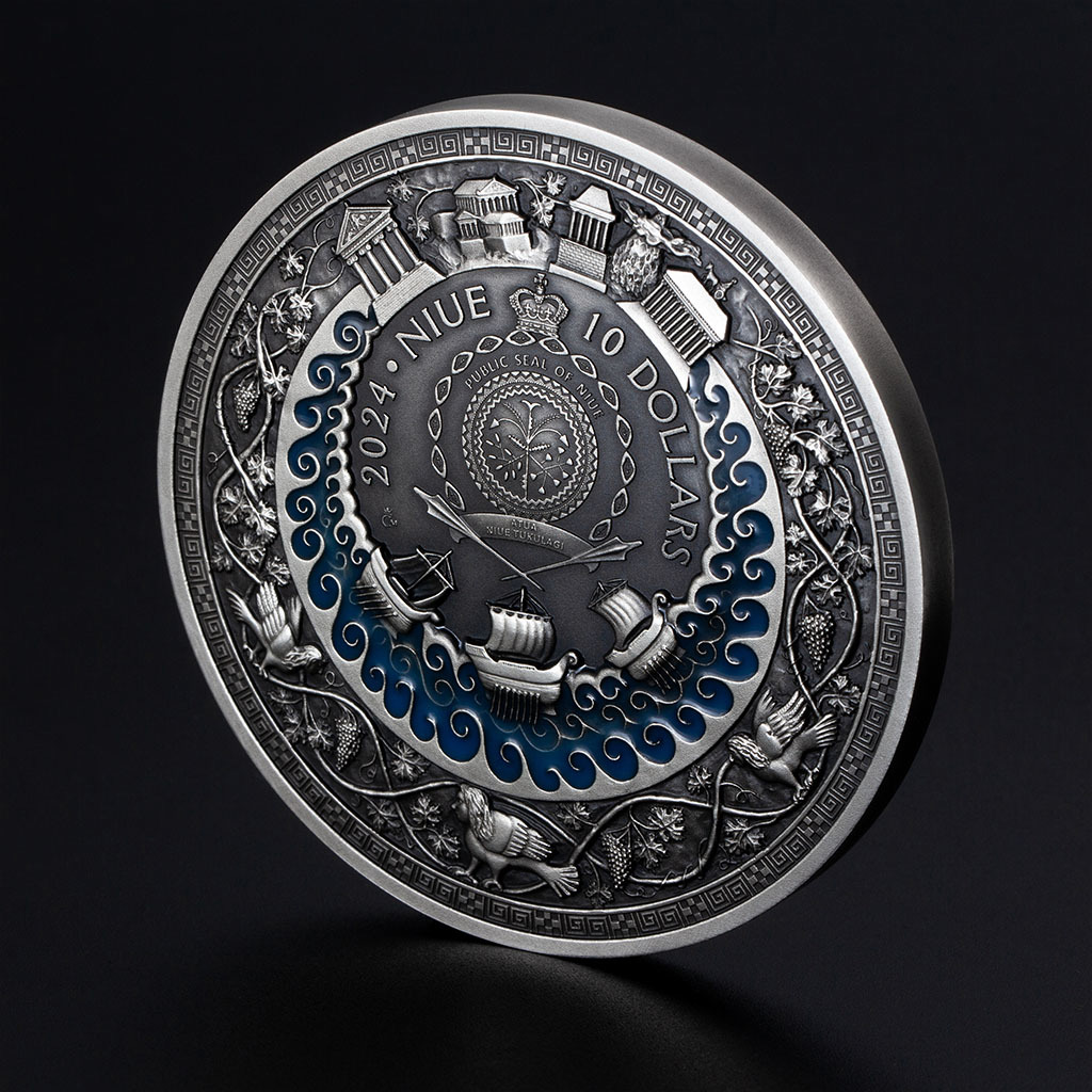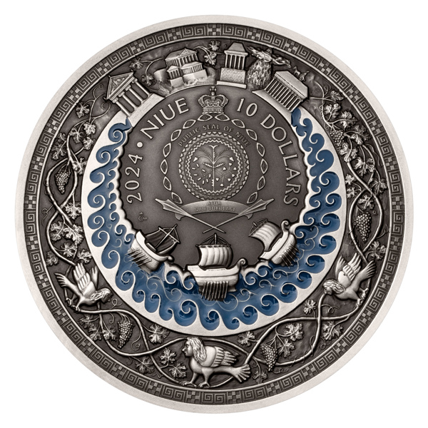 Na reverzní straně mince, která je dílem medailérky Petry Brodské, DiS., najdete Iásóna, Argó, ohnivé býky, draka, zlaté rouno, Médeiu a celou řadu dalších bájných detailů. Averzní strana, která je společná celému cyklu, pak předkládá antické lodě, chrámy či harpyje a především Středozemní moře tvořené transparentním smaltem. To vše je obklopeno helénským dekorem. Protože mince České mincovny vycházejí v licenci zahraničního emitenta, kterým je ostrov Niue, jejich averz nese ještě jeho nezbytné atributy – státní znak, nominální hodnotu 10 DOLLARS (NZD) a rok emise 2024.