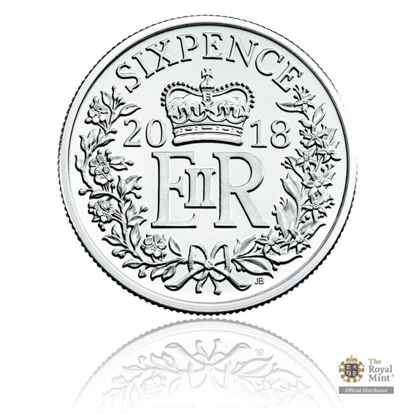 Reverzní strana šestipence předkládá monogram královny Alžběty II., královskou korunu, květinový dekor, nominální hodnotu SIXPENCE (GBP) a letopočet emise 2018. Averzní strana pak nese portrét panovnice doplněný opisem „ELIZABETH II DEI GRA REG FID DEF“ (Alžběta II., z Boží milosti královna, ochránkyně víry).
