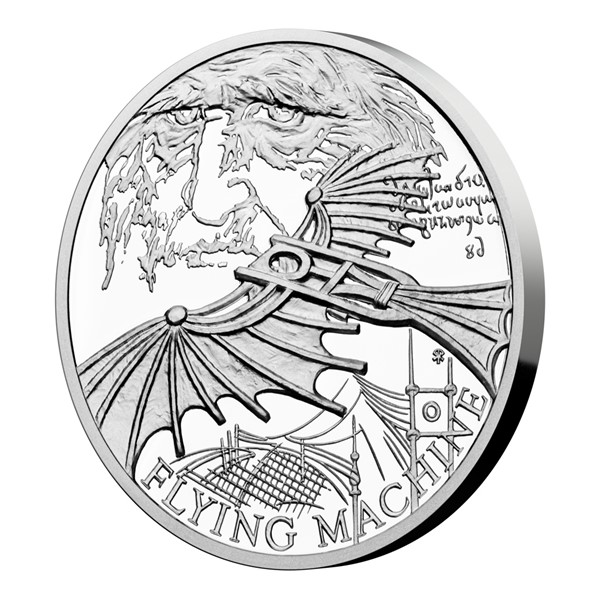 Autorem celé minisérie je medailér Asamat Baltaev, DiS. Při tvorbě reverzní strany se inspiroval Leonardovými deníky – na nákres kluzáku opatřený poznámkami shlíží sám renesanční maestro. Kompozici reverzu uzavírá anglický opis FLYING MACHINE (čili létající stroj). Averzní strana mince pak předkládá všechny vynálezy, které se v minisérii postupně objeví – helikoptéru, kluzák, kulomet a tank. To vše je propojeno s atributy ostrova Niue, který je emitentem mince. Protože mince České mincovny vycházejí v této zahraniční licenci, nesou jméno a portrét královny Alžběty II., nominální hodnotu 1 DOLLAR (NZD) a rok emise 2019.