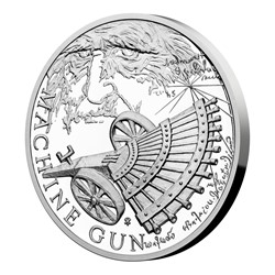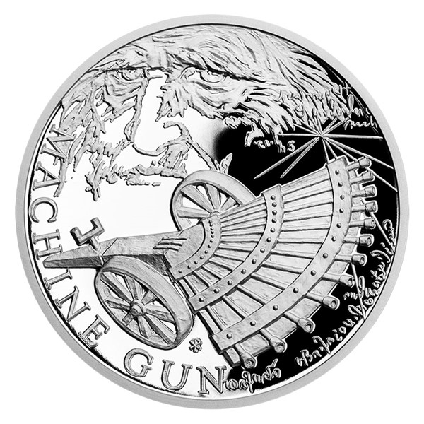 Po dvou létajících strojích se v minisérii s názvem Vynálezy Leonarda da Vinci objevuje první stroj válečný. Stříbrná mince České mincovny představuje Leonardův kulomet.