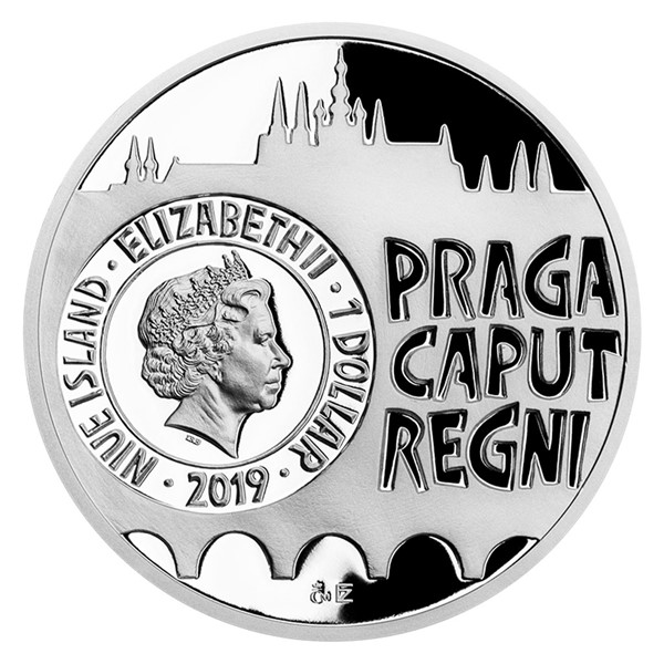 Reverzní straně hradčanské mince vévodí pohled na hlavní průčelí katedrály svatého Víta s rozetou. Akademický sochař Zbyněk Fojtů výjev doplnil latinským opisem HRADTSIN (Hradčany) a historickým znakem města. Averzní strana je společná celé minisérii a předkládá pražskou siluetu (ohraničenou Pražským hradem a Karlovým mostem) doplněnou nápisem PRAGA CAPUT REGNI (Praha hlava království). Averz mince nese ještě jméno a profil královny Alžběty II., rok emise 2019 a nominální hodnotu mince 1 DOLLAR (NZD) – tj. atributy tichomořského ostrova Niue, který České mincovně propůjčuje licenci k ražbě vlastních pamětních mincí.