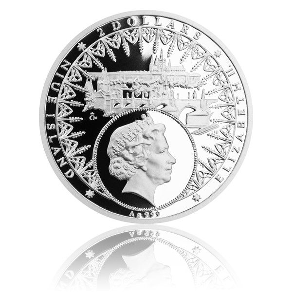 V mimořádném lesku kvality proof se na averzu skví kruhové výjevy dvou pražských dominant - Karlova mostu a Hradčan - zářících na pozadí věží historických staveb Staroměstského náměstí. Doplňuje je portrét a jméno královny Alžběty II., nominál 2 DOLLAR, označení ryzosti a váhy mince (1 oz silver 999 určující nejvyšší kvalitu ryzího stříbra) a také jméno emitenta - tichomořského ostrova Niue Island.