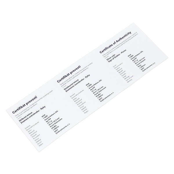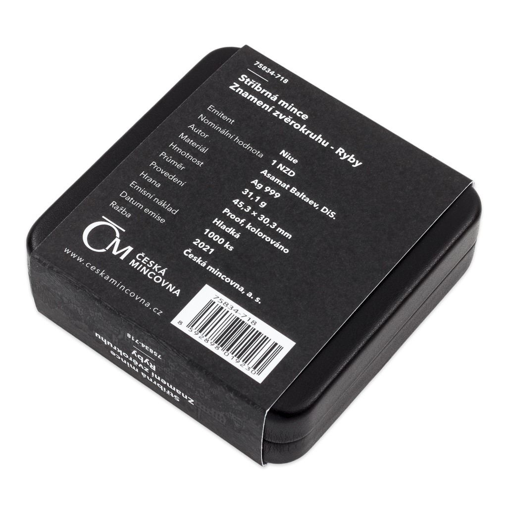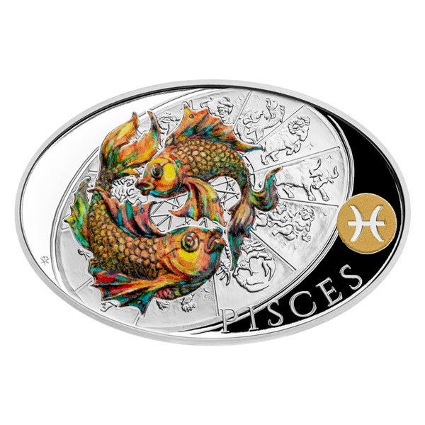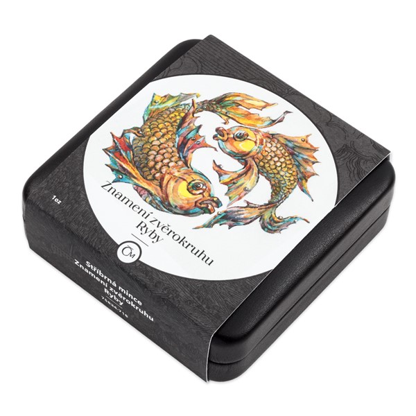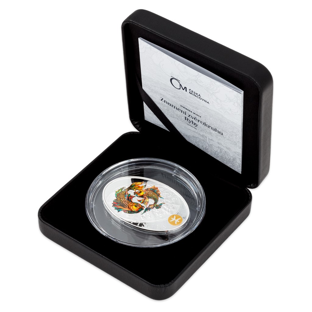 Stříbrná mince České mincovny z dárkové série s motivy 12 znamení zvěrokruhu se stane nejen krásným, ale také hodnotným talismanem pro každého, kdo se narodil ve znamení Ryb.