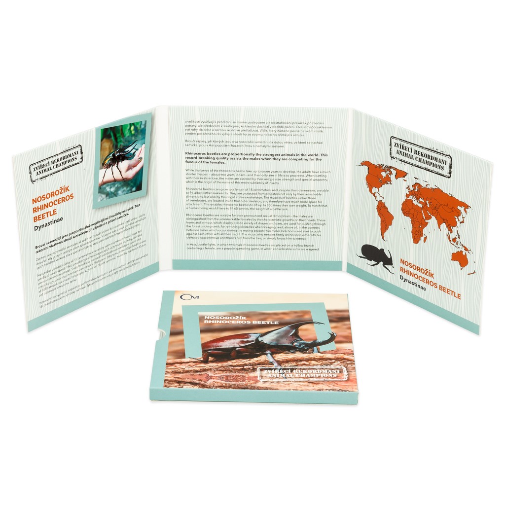 Druhá stříbrná mince České mincovny z druhého ročníku cyklu „Zvířecí rekordmani“ je věnována nosorožíkům. Tito brouci, kteří se v řadě variací vyskytují po celém světě, jsou proporcionálně nejsilnějšími živočichy na světě.