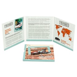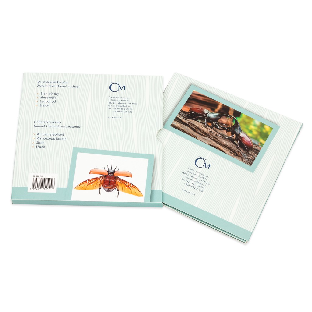 Mince je zasazena do výpravného balení. Najdete v něm fotografie a česko-anglický text, který popisuje rekordní vlastnost nosorožíků. Nezapomeňte, že mince z cyklu Zvířecí rekordmani si můžete ukládat do praktického sběratelského boxu.