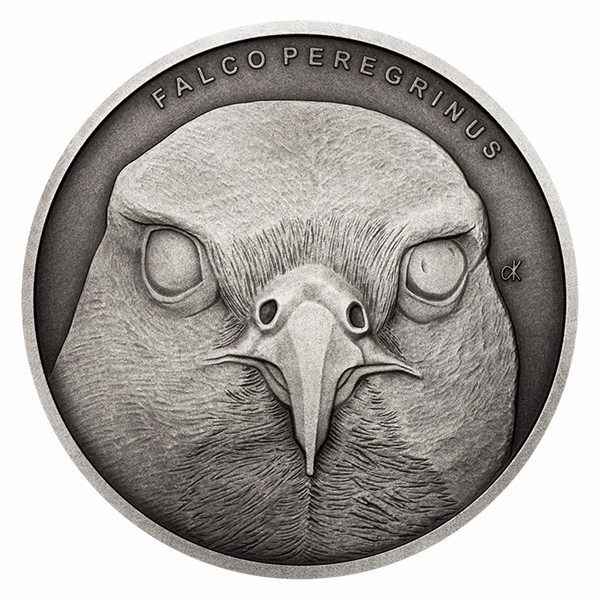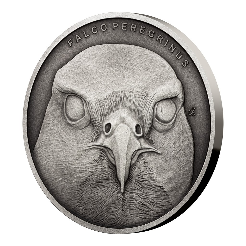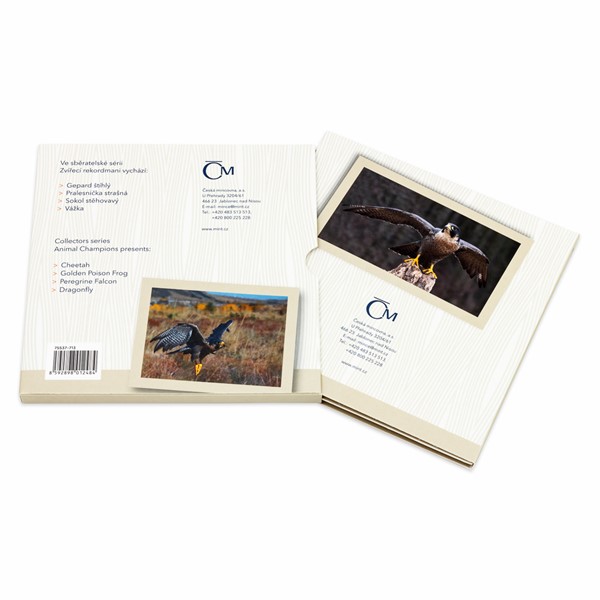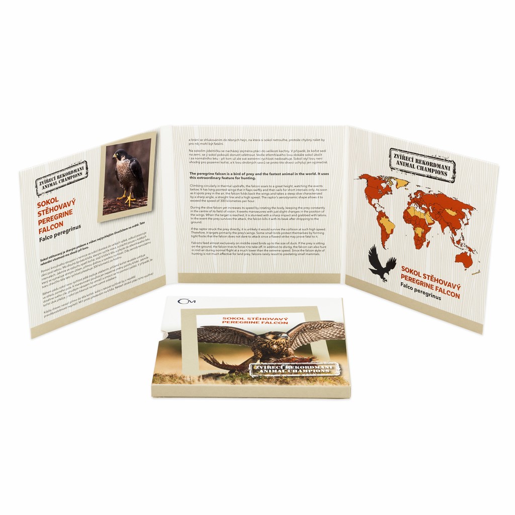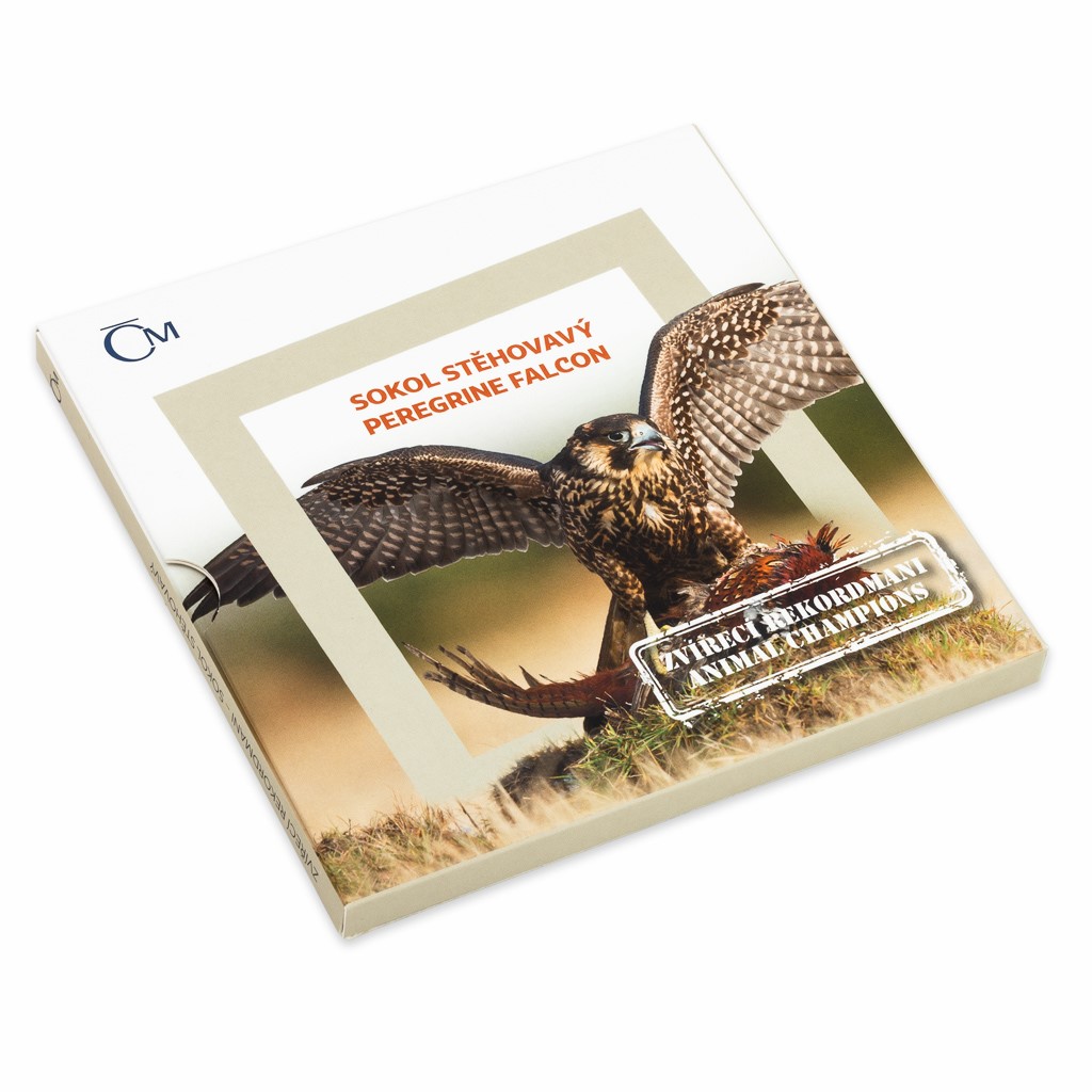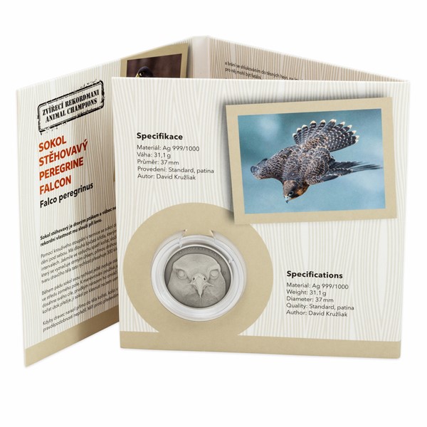 Na třetí stříbrné minci zkrášlené patinou z cyklu České mincovny Zvířecí rekordmani se objevuje sokol stěhovavý. Tento dravý pták je vůbec nejrychlejším živočichem na světě.