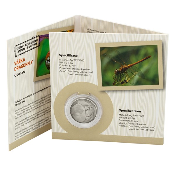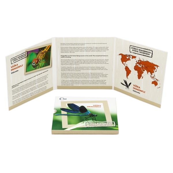 Nedílnou součástí mince je výpravné balení. Najdete v něm fotografie a česko-anglický text, který popisuje rekordní vlastnosti vážek. Nezapomeňte, že mince z cyklu Zvířecí rekordmani si můžete ukládat do praktického sběratelského boxu.