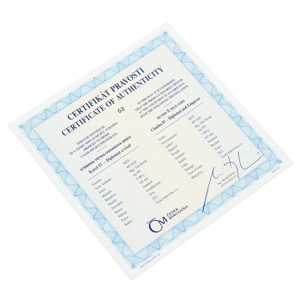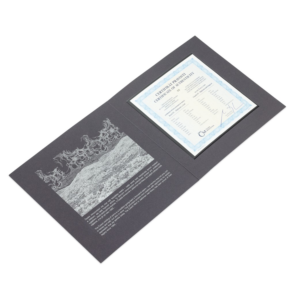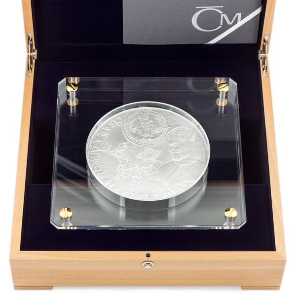 V reliéfu největší stříbrné mince České mincovny se objevuje Karel IV., který je nezřídka veleben jako největší Čech všech dob. Majestátní ražba o hmotnosti pěti kilogramů ho představuje jako císaře a diplomata.