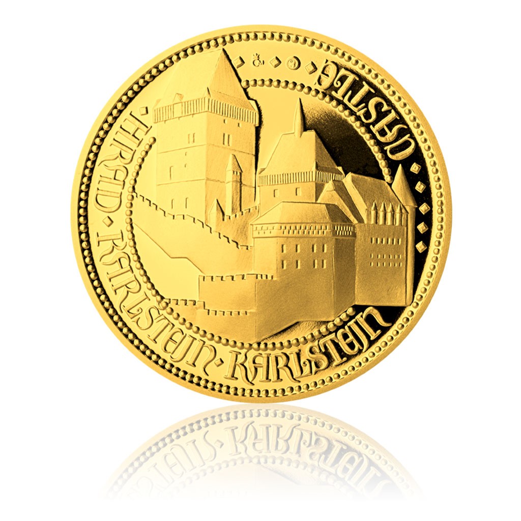 Mimořádnost této opevněné klenotnice si zaslouží exkluzivní emisi. Pozlacená uncová medaile Karlštejn ze série doba Karla IV. je skutečným uměleckým dílem, jehož předlohy se zhostil proslulý výtvarník MgA. Josef Oplištil, který realizoval již 11 pamětních mincí pro ČNB. Averz stříbrné medaile zdobí nezaměnitelné panorama mohutného gotického hradu a dvojjazyčný název stavby. Reverzu dominuje portrét panovníka obklopeného proslulými stavbami, k nimž dal za své vlády podnět. Nápisy na reverzu uvádí název série a také letopočty králova narození a úmrtí.