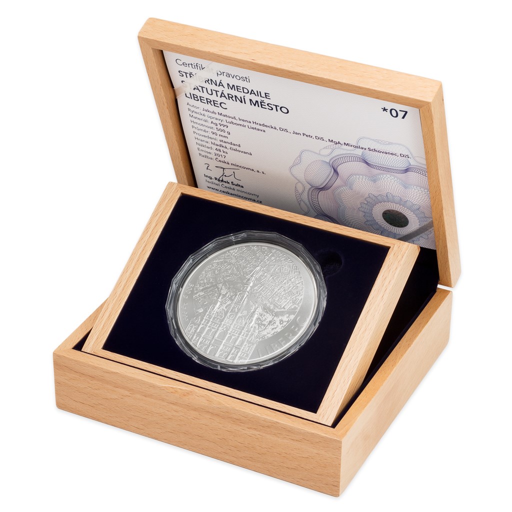 Domovem České mincovny je Liberecký kraj, jehož srdcem je severočeský Liberec. Vedle krajského sídla je jedním z 26 statutárních měst České republiky, a tak mu náleží stříbrná medaile o hmotnosti jedné poloviny kilogramu, která je součástí sběratelského cyklu České mincovny.