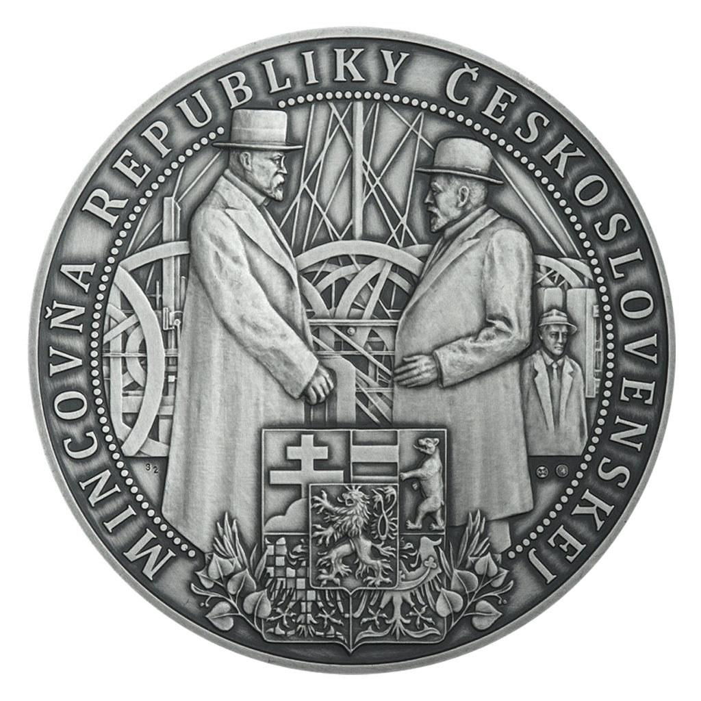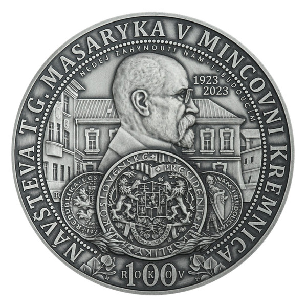 Stříbrná pamětní medaile s patinou připomíná 100. výročí návštěvy prezidenta T. G. Masaryka ve státní mincovně v Kremnici.