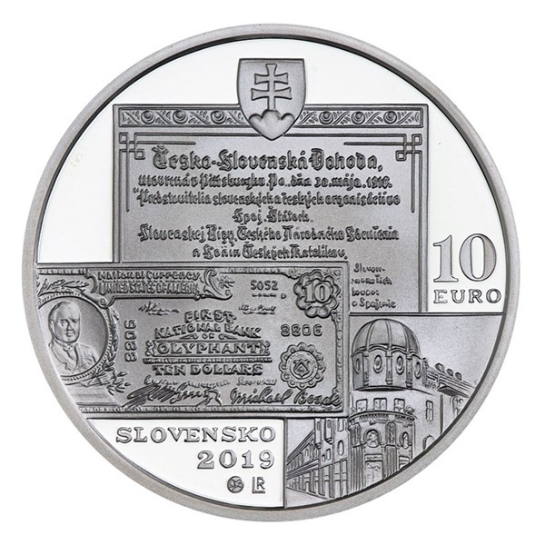 Reverzní straně mince vévodí portrét bankéře doplněný jeho jménem a životními letopočty – MICHAL BOSÁK, 1869–1937. Dále reverz předkládá logo a budovu Bosákovy banky ve Scrantonu. Averzní strana mince pak nese trojici tematických motivů – budovu Bosákovy banky v Prešově, Pittsburskou dohodu a desetidolarovou bankovku, kterou Michal Bosák coby bankovní prezident podepsal. Kompozici dotváří nápis SLOVENSKO, státní znak, nominální hodnota 10 EURO a rok emise 2019. To vše je dílem medailéra Mgr. art. Romana Lugára.