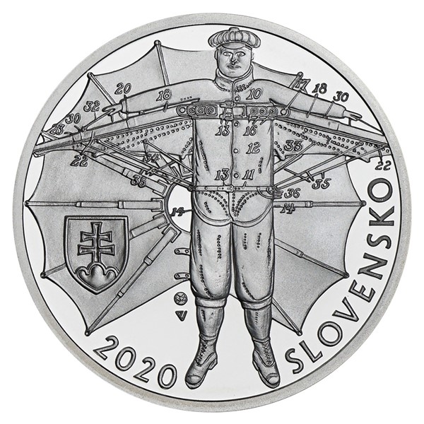 Reverzní strana mince s nominální hodnotou 10 EURO, která je dílem medailéra Mgr. art. Petera Valacha, předkládá portrét Štefana Baniče. Averzní strana pak nese podrobný technický nákres Baničova padáku převzatý z originální patentové listiny.