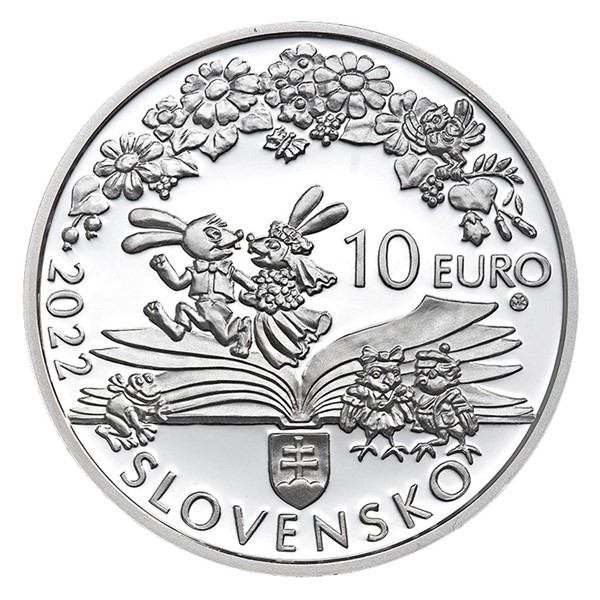 Reverzní strana mince, která je dílem medailéra Asamata Baltaeva, DiS., předkládá věrný portrét Ľudmily Podjavorinské olemovaný květinovou girlandou. Mezi květy se ukrývají vrabčáci z veršované pohádky Čin-čin. Portrét doprovází ještě spisovatelčino jméno a životní letopočty. Averzní straně pak vévodí otevřená kniha, ze které vyskakují nejen už zmínění vrabčáci, ale také zajíčci a žabák z pohádek Zajko bojko a Žabiatko. Kompozici averzu dotváří nominální hodnota 10 EURO, nápis SLOVENSKO, letopočet emise 2022 a slovenský státní znak.